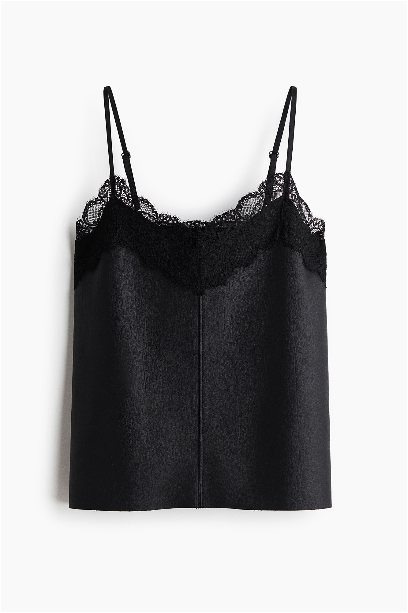 Топ из креп-джерси с кружевной отделкой по верху, V-образным вырезом спереди и узкими регулируемыми бретелями.