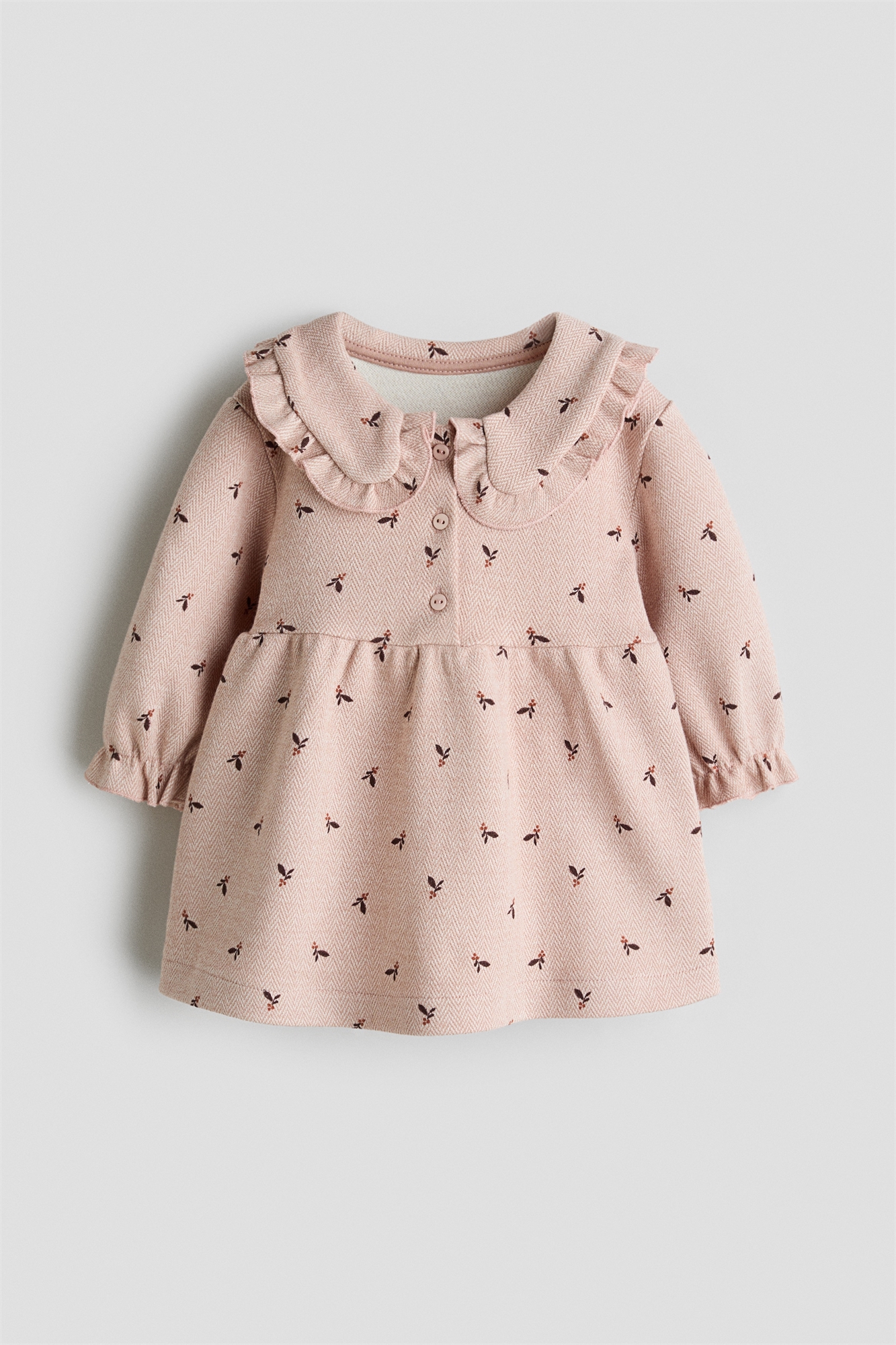 Платье из мягкого, фактурного хлопкового джерси с принтом на всю длину. Круглый воротник с оборками, пуговицы сверху, длинные рукава с оборками на манжетах и расклешенная юбка.