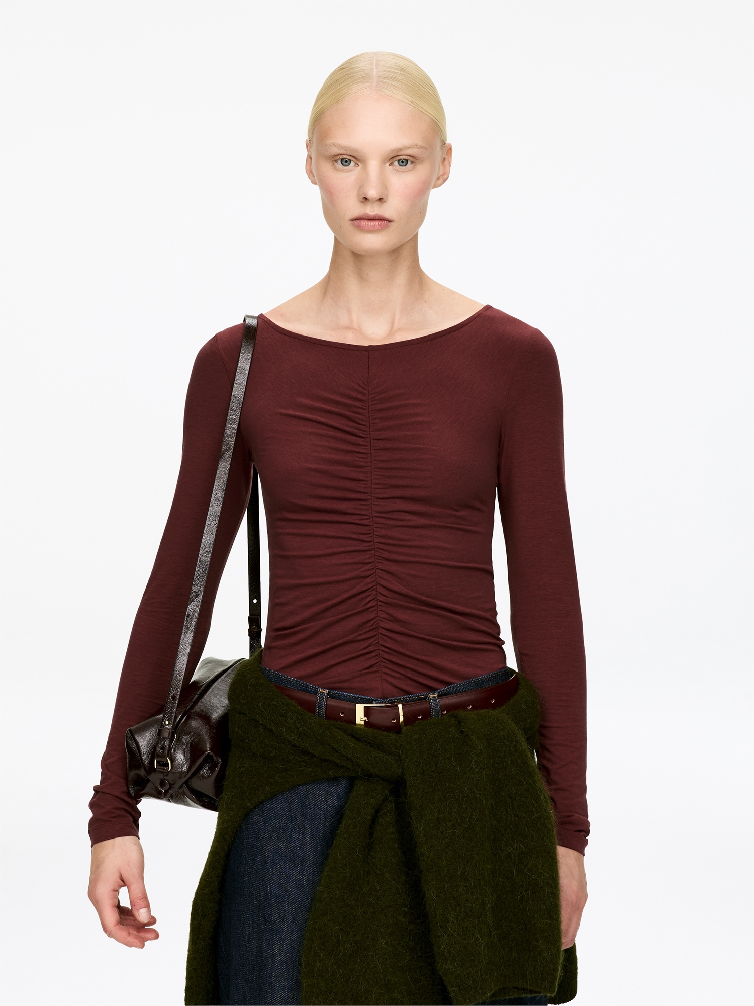 Топ из джерси с добавлением эластана и хлопка-лайоцелла. Модель с V-образным вырезом горловины. Фасон собран по центру спереди и сзади.