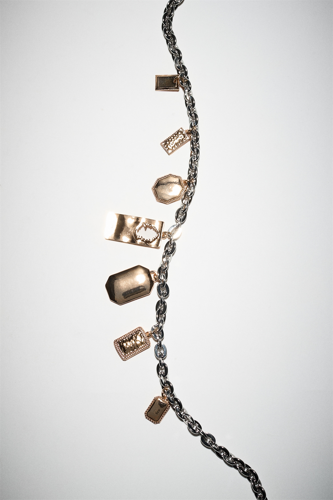 Ожерелье из толстой металлической цепочки с шармами спереди. Регулируемая длина с застежкой-триггером.