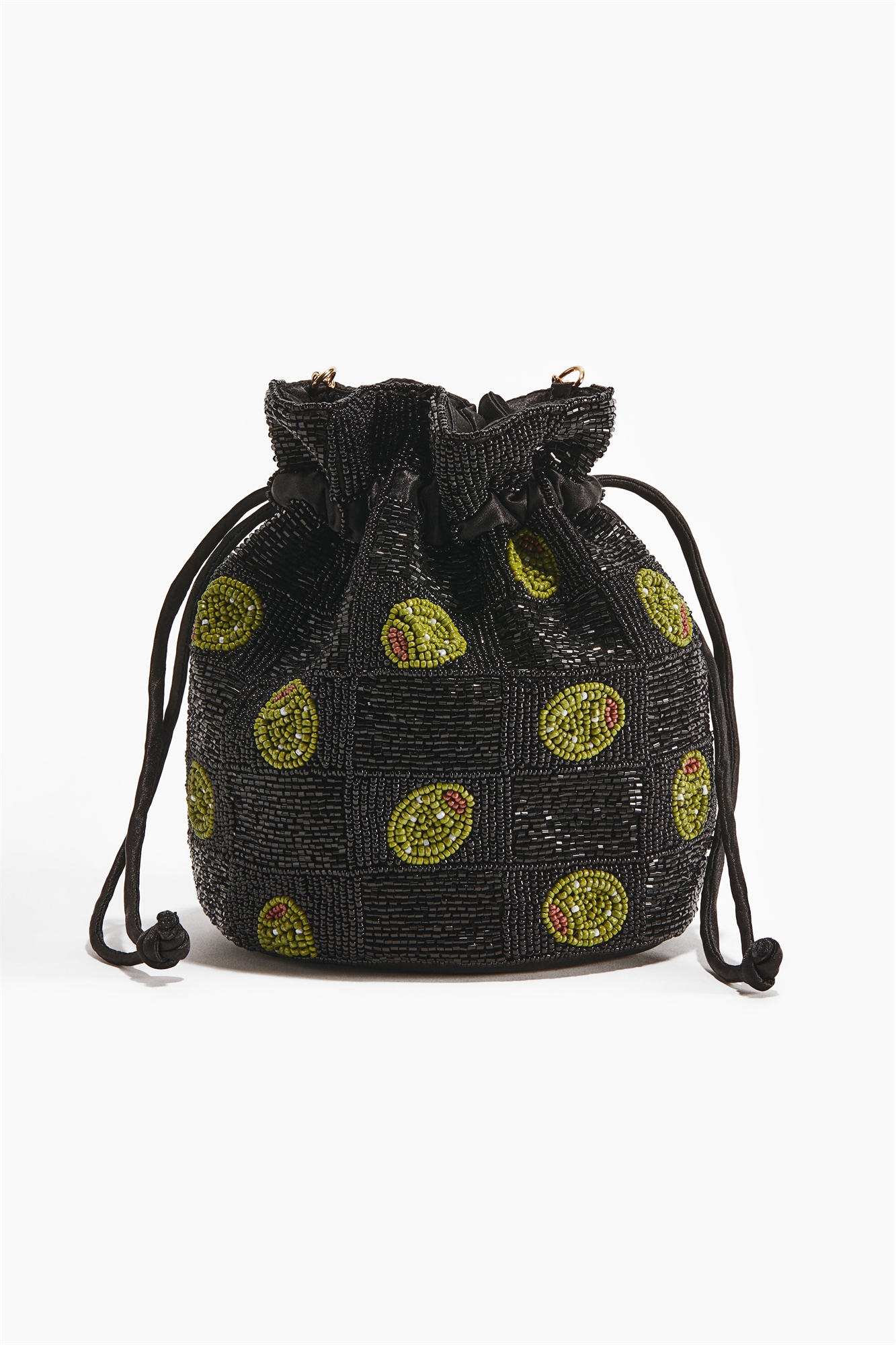 Сумка-ведро из блестящего атласа с одной стороны украшена мелкими стеклянными бусинами, создающими забавный, привлекающий внимание узор. Застежка на шнурке и плечевой ремень с металлической цепочкой. На подкладке.