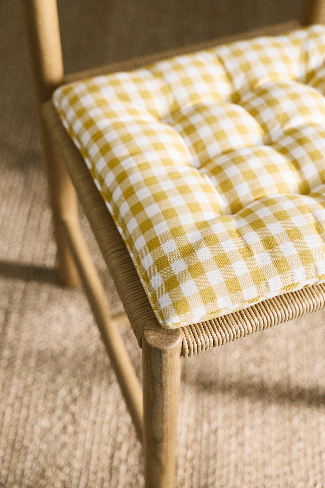 Пара мягких подушек для сидений из хлопчатобумажной ткани с клетчатым узором и стегаными узелками.