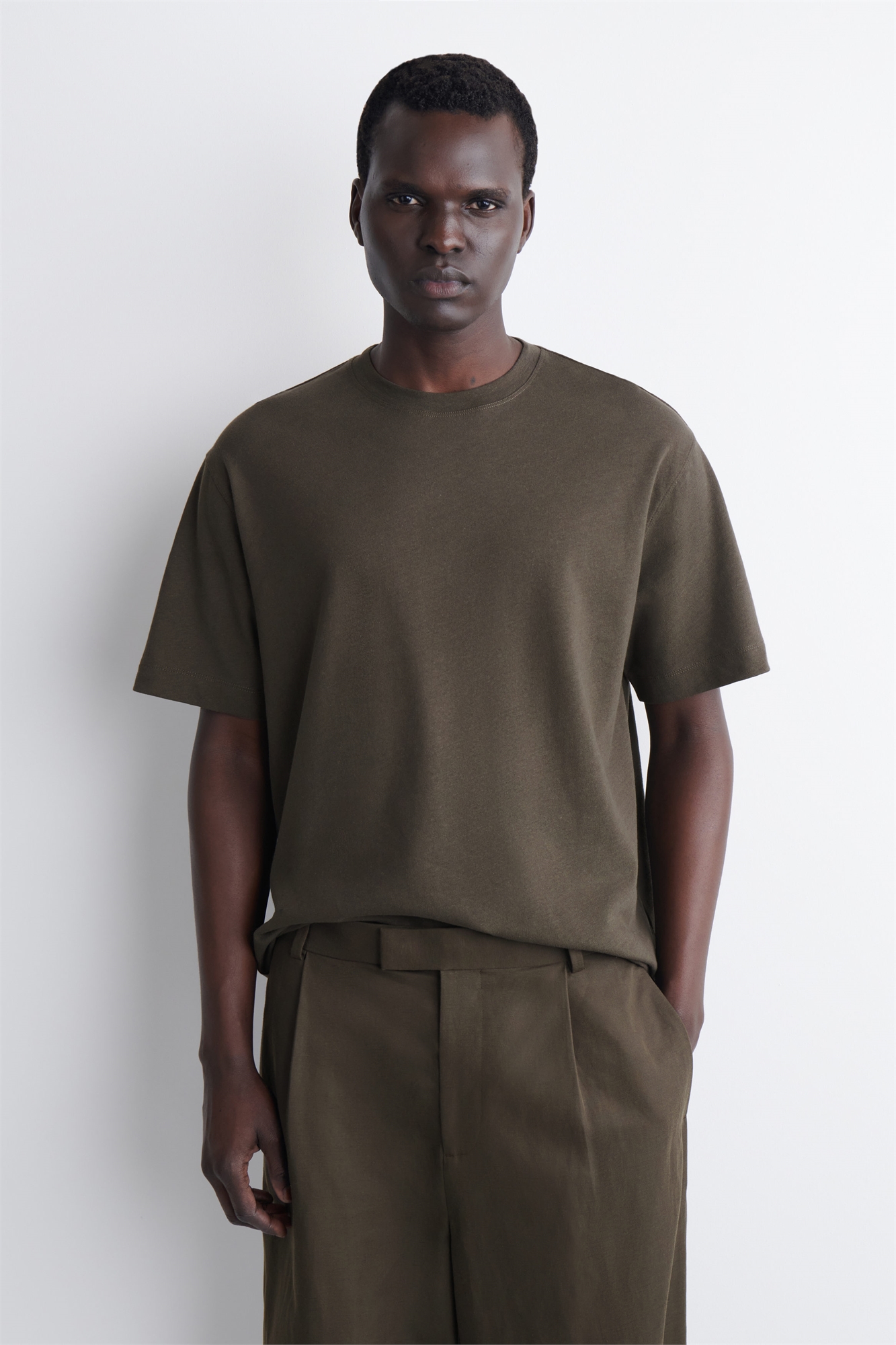 Эта футболка, созданная для весенне-летнего гардероба, изготовлена из хлопкового джерси плотностью 215 г/м² с добавлением льна для мягкости и воздухопроницаемости. Она имеет свободный крой, ребристый круглый вырез, короткие рукава и тональные отстрочки.Свободный крой 215 г/м² Машинная стирка Длина спинки размера M составляет 67,7 см / Модель носит размер M