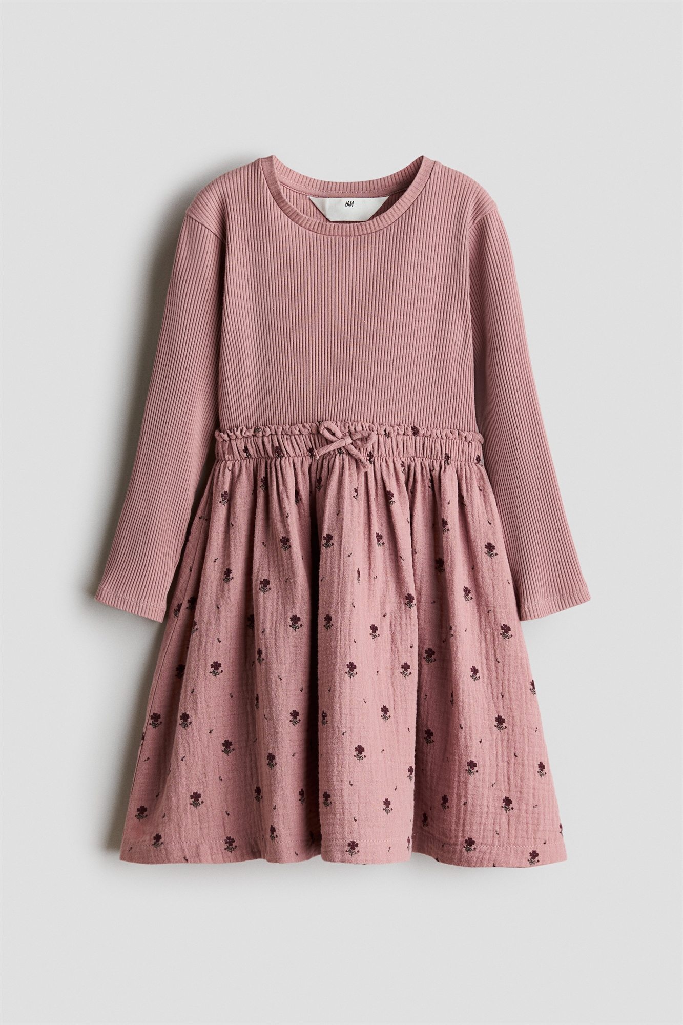 Платье с длинными рукавами из мягкого хлопка с верхней частью из ребристого джерси и юбкой из набивного муслина. Круглый вырез с ребристой отделкой и эластичная резинка на талии с оборкой и декоративным бантом спереди.