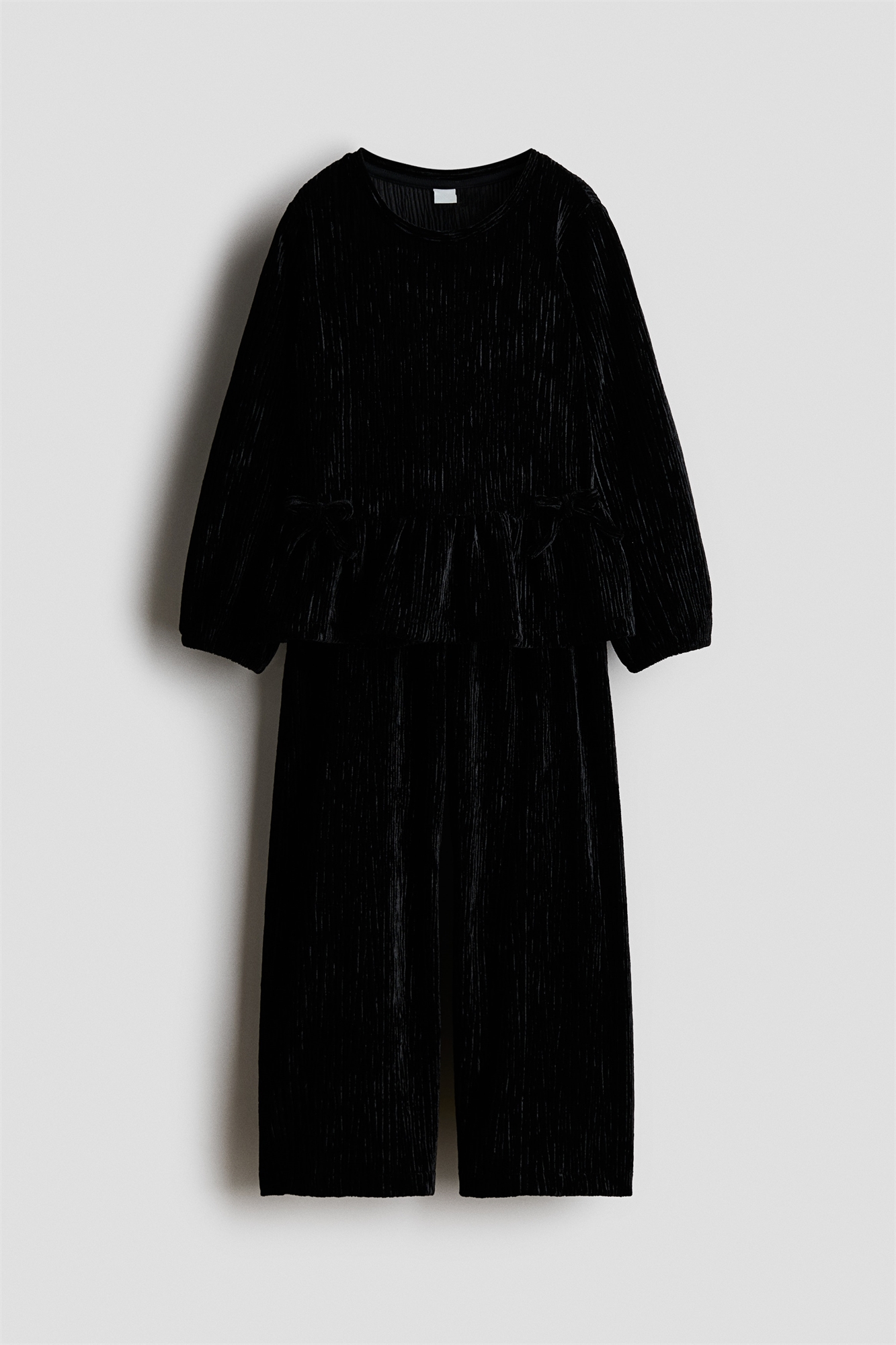 Комплект из топа и брюк из мягкого мятого велюра. Топ украшен маленькими бантиками спереди. Круглый вырез горловины, длинные рукава и пеплум. Брюки с эластичным поясом и широкими штанинами.