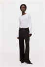 Брюки свободного кроя из плотного трикотажа Ponte di Roma с высокой талией, скрытой резинкой, имитацией ширинки и ремнем с металлической пряжкой. Диагональные боковые карманы и широкие брючины со складками спереди.