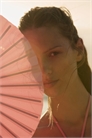 Складной вентилятор из пластика и ткани с металлической шпилькой в нижней части.