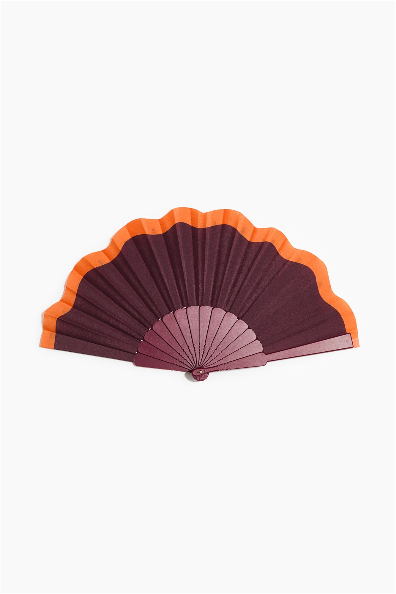 Складной веер из пластика и ткани с металлической заклепкой внизу.