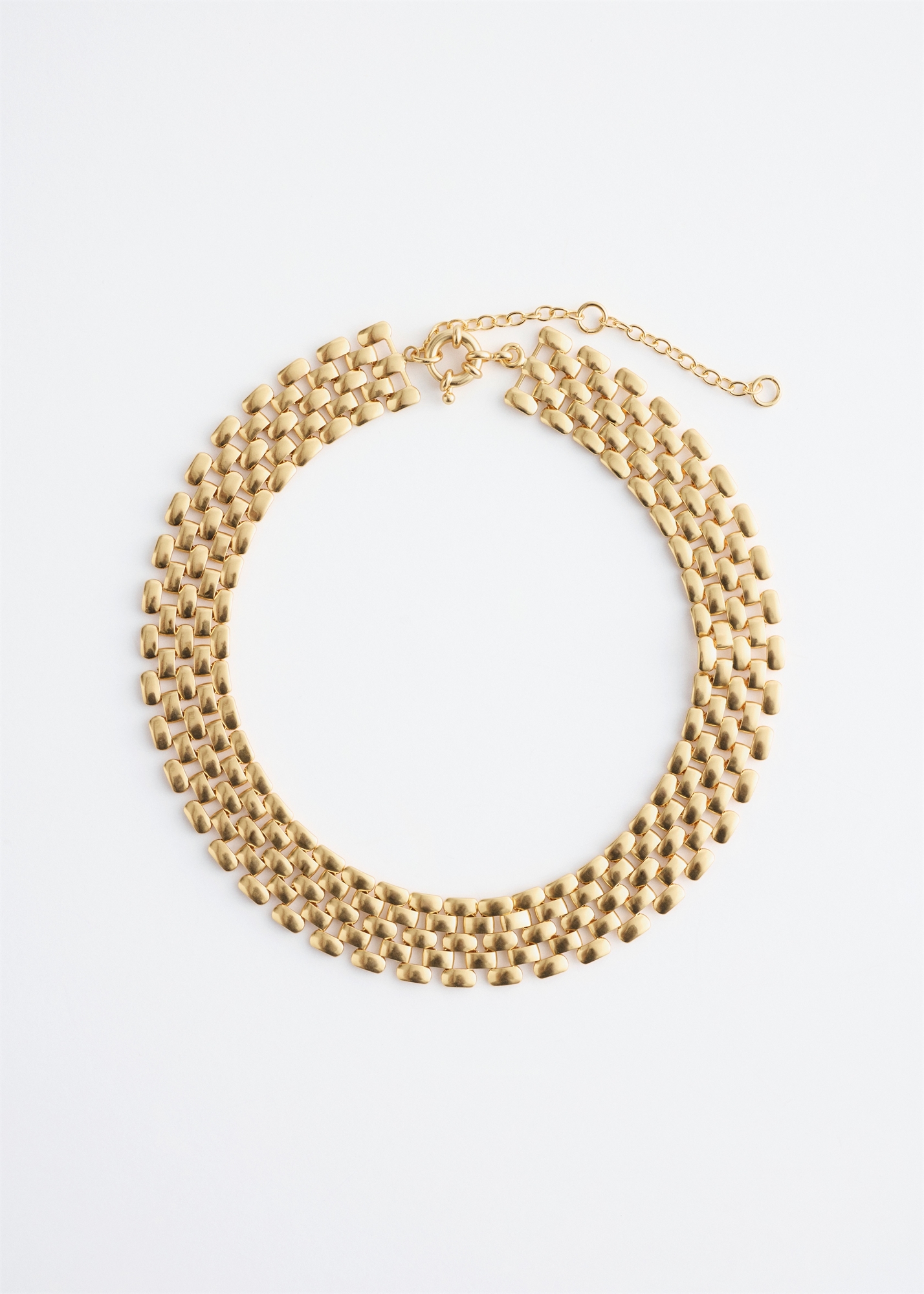 Это колье, представляющее собой современную интерпретацию классического чокера, изготовлено из полированной латуни и украшено сложенными квадратами, образующими архитектурный узор цепочки. Нежное украшение для вашей шеи с застежкой-пряжкой для надежной и регулируемой посадки.
