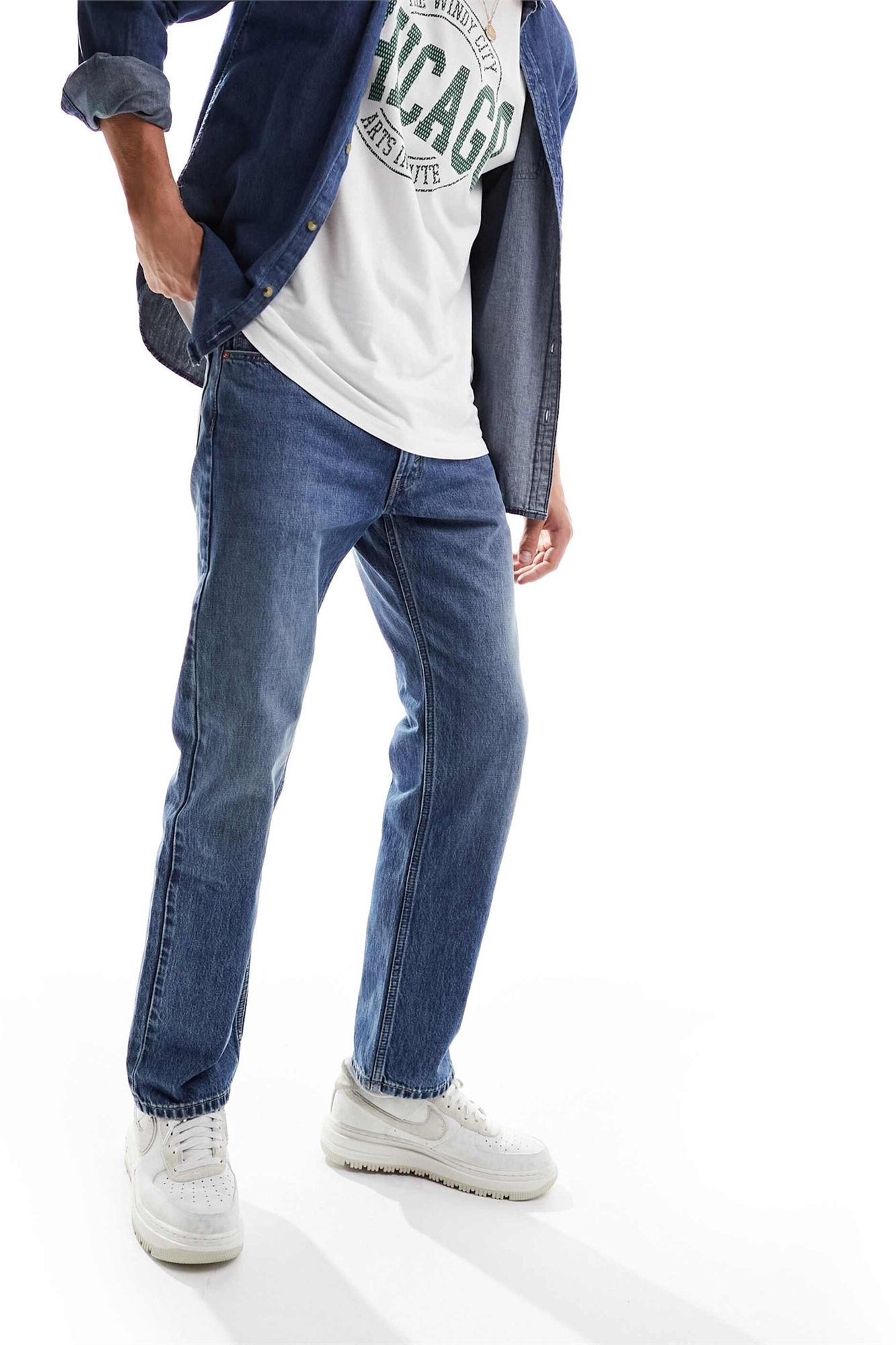 Неэластичный деним: средне-синий оттенок Основной материал: 100% хлопок.