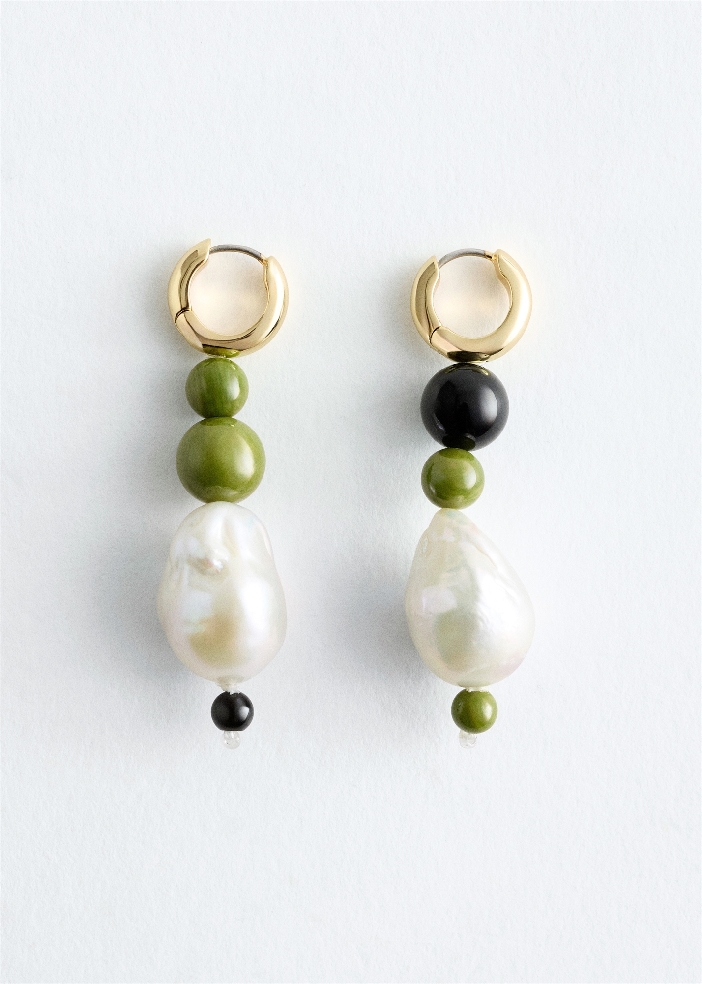 Эти серьги с обручами из полированной латуни в верхней части, с подвеской, подвешенной на нити бусин, включая каменные сферы и пресноводную жемчужину неправильной формы. Проверено никелем Застежка-петля для легкого надевания и снимания