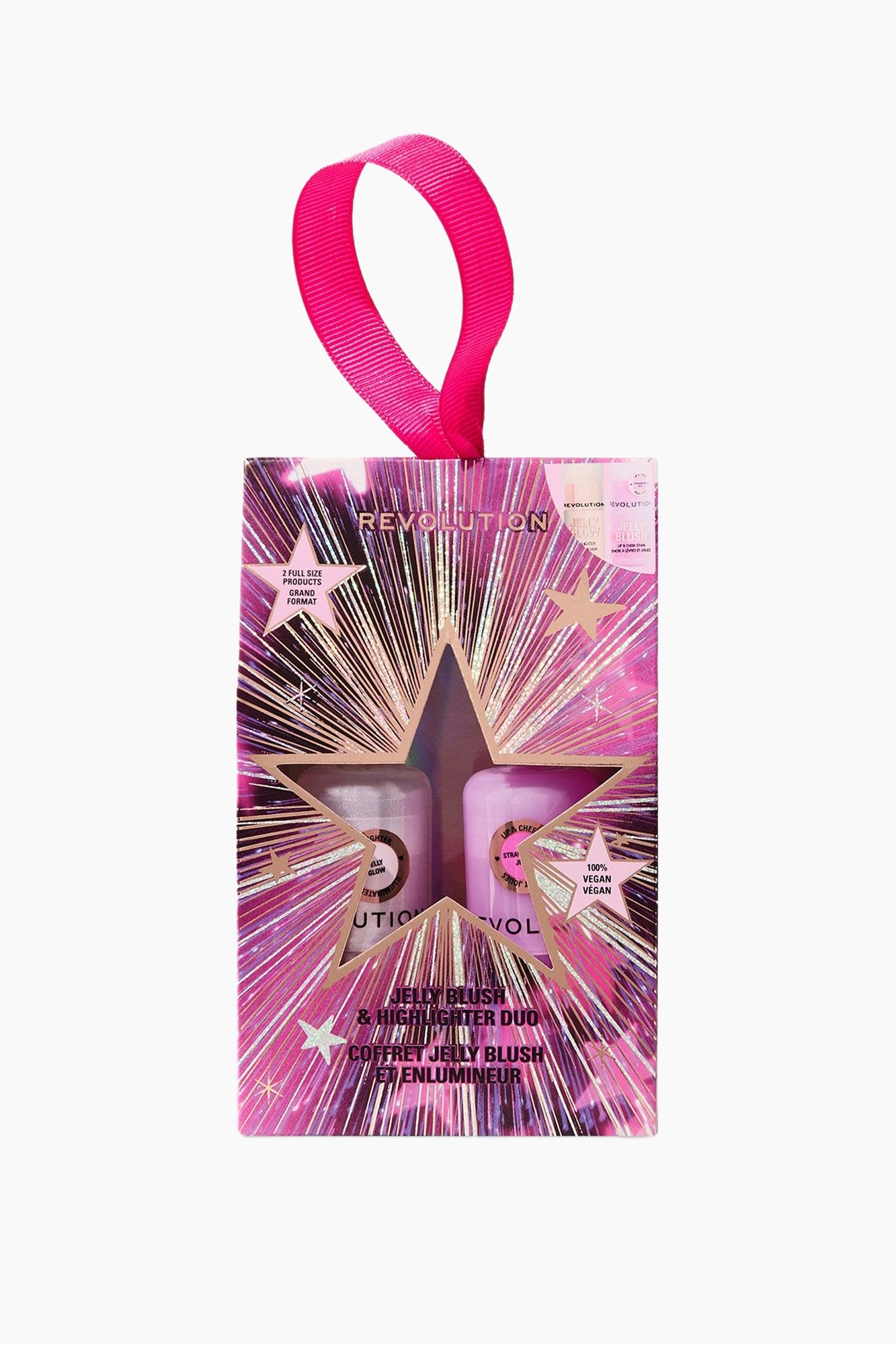 Набор румян и хайлайтеров Revolution Jelly Blush & Highlighter Set - идеальный дуэт для любителей румян и желе. В набор входят два полноразмерных фаворита - вирусные румяна Jelly Blush Stick в клубнично-розовом цвете и хайлайтер Jelly Highlight Stick, которые обеспечивают растушевку цвета и эффект сияния для губ и щек. Увлажняющее и легкое нанесение - для создания желейного образа в два простых шага. Почему вам понравится: 2 полноразмерные гелевые иконки Содержит вирусный стик Jelly Blush Stick и стик Jelly Highlighter Stick Сочный, росистый финиш с упругой текстурой Идеально подходит для сияющего, свежего цвета лица 100% без жестокости и веганства