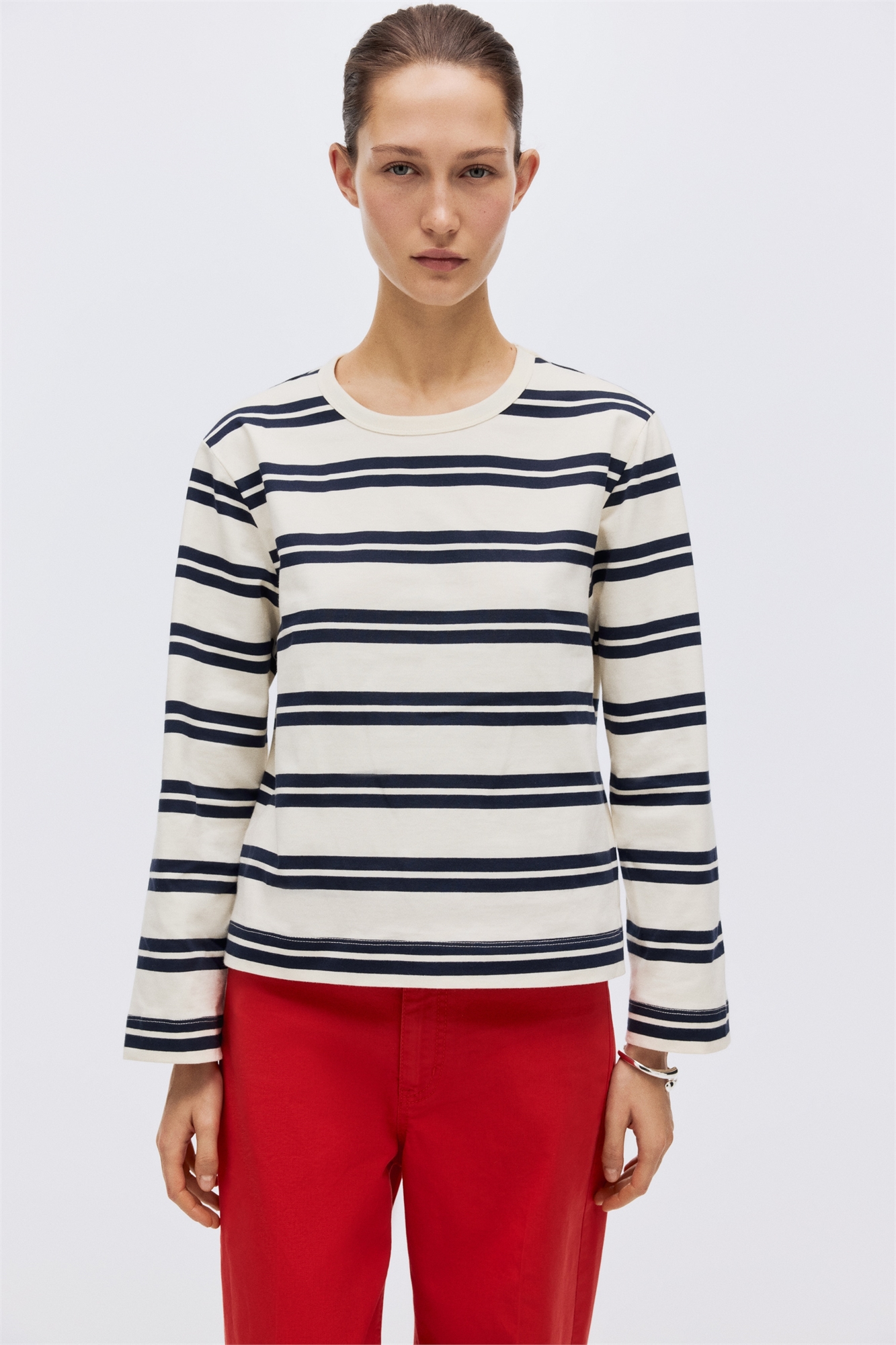 Футболка оверсайз с длинными рукавами из мягкого хлопкового джерси с круглым вырезом и слегка спущенными плечами.