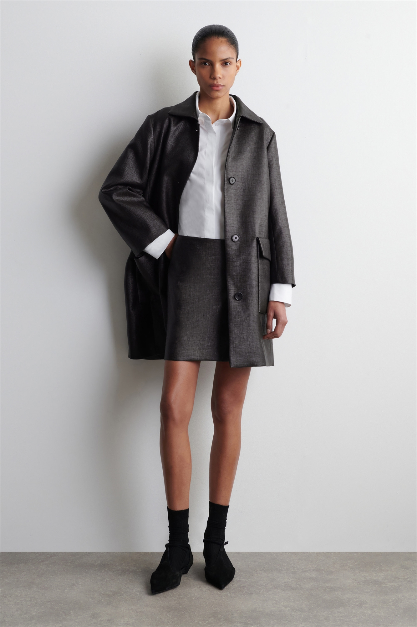 Эта современная мини-юбка изготовлена из текстурированной хлопковой смеси и выполнена в графитовом оттенке, который тонко блестит под светом. Она имеет потайную застежку-молнию и формирующие вытачки на талии. Сочетайте ее с туфлями на невысоком каблуке для вечернего выхода. Стандартный кройЗастежка-молнияХимчистка Длина спинки для размера EU 36 составляет 36,5 см / Модель носит размер EU 36