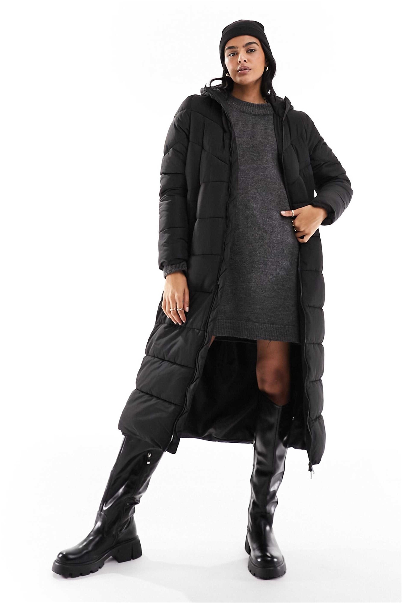 Длинное утепленное пальто с капюшоном