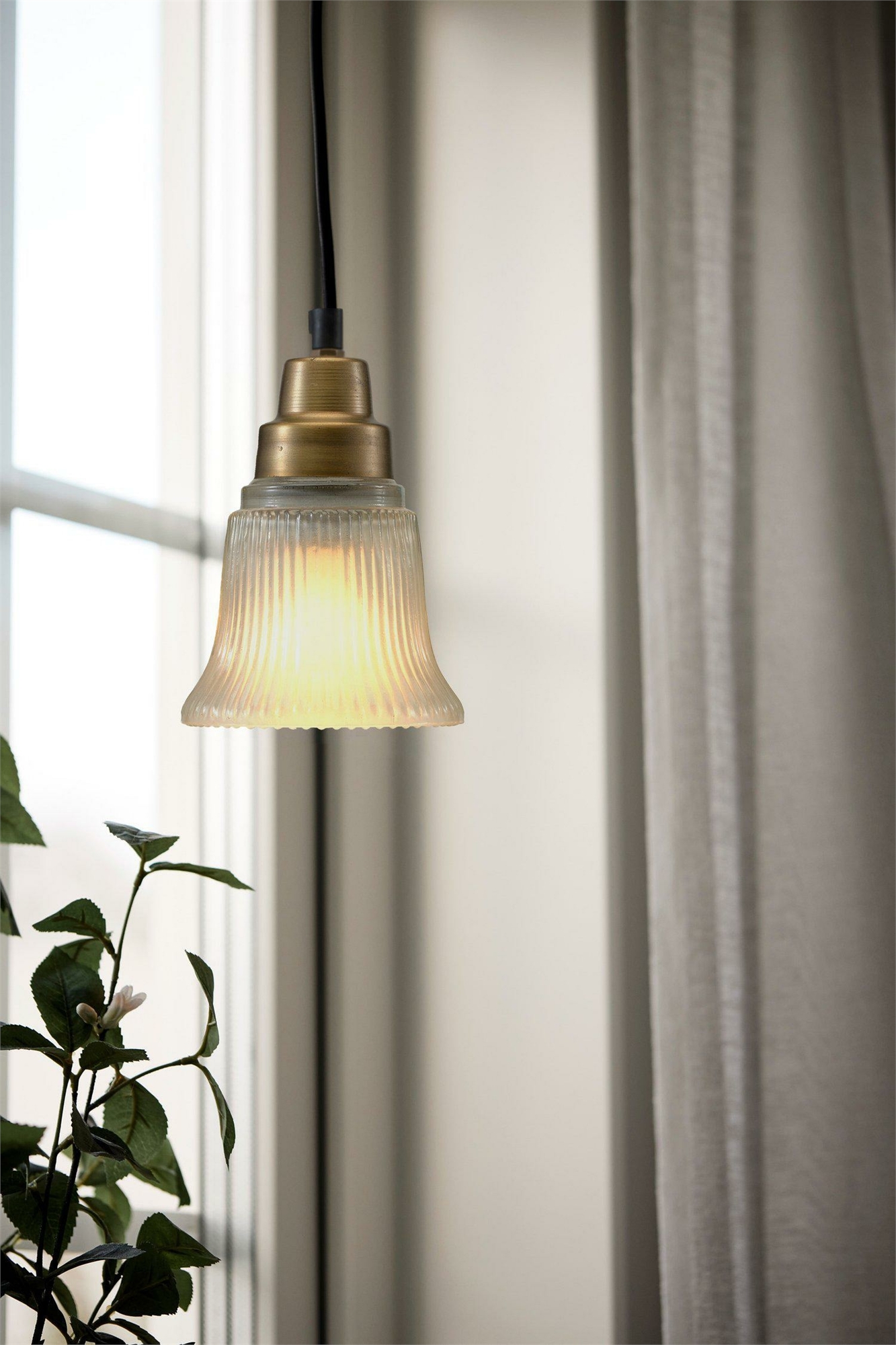 Небольшой подвесной светильник Emmi с колоколообразным ребристым стеклянным абажуром и металлическими деталями цвета латуни. Красивая подвесная лампа небольшого размера в классическом винтажном дизайне. Обеспечивает теплый свет благодаря зеленому ребристому стеклу. Черный текстильный кабель 3,5 м с плоской вилкой ЕС. Диаметр 12 см, высота 18 см. Патрон E27, макс. 25 Вт (для улучшения освещения рекомендуется использовать прозрачную маленькую светодиодную лампочку в форме мяча для гольфа). IP20. Лампочка в комплект не входит.