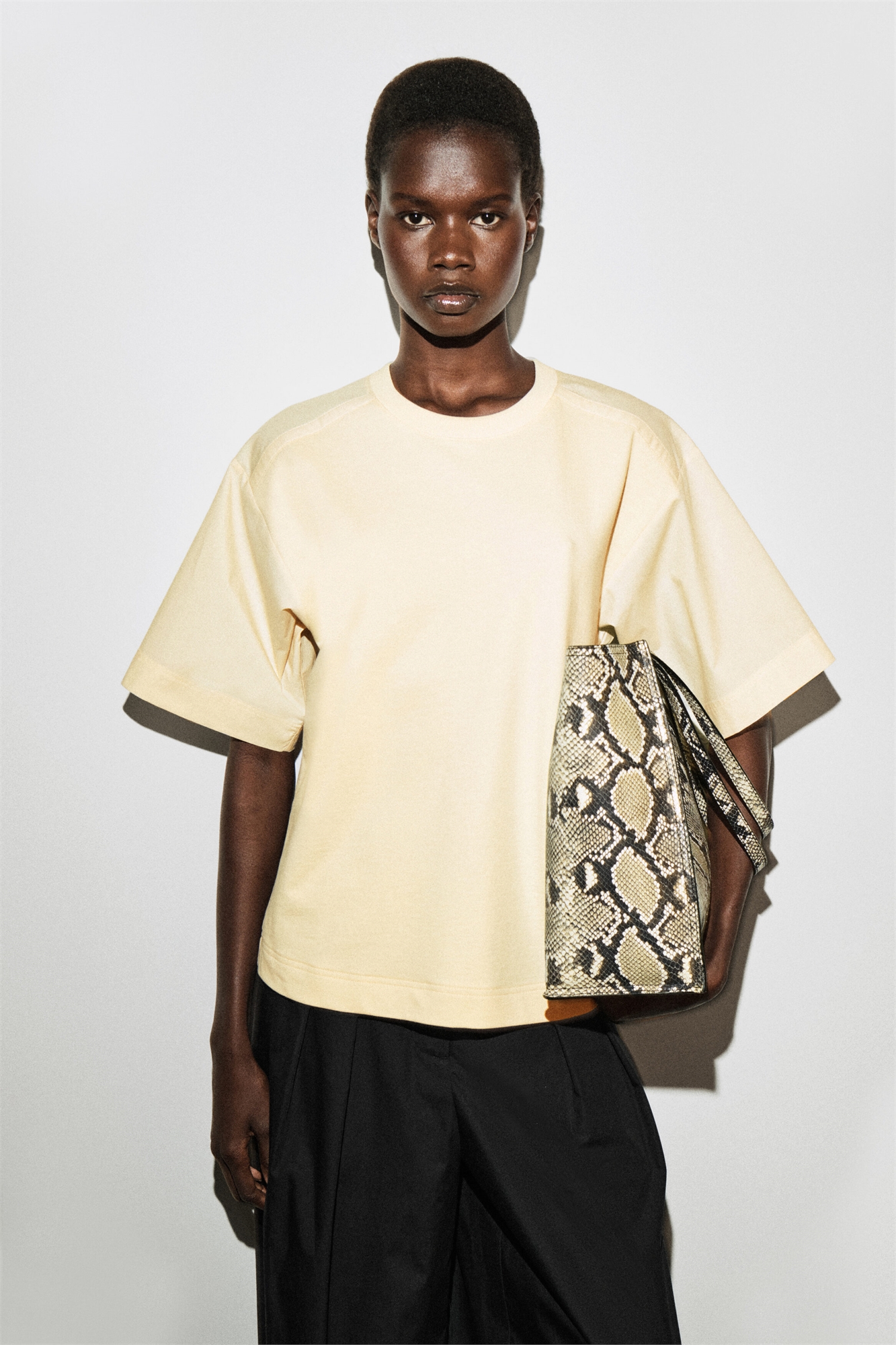 Эта футболка, представляющая собой контрастное сочетание материалов, изготовлена из мягкого хлопкового джерси с рукавами из плотного поплина. Она выполнена в сдержанном оттенке сливочного цвета и имеет ребристый круглый вырез и свободные короткие рукава. Стандартный крой. Плотность ткани: 230 г/м². Машинная стирка. Длина спинки размера S составляет 56 см. Модель носит размер S.