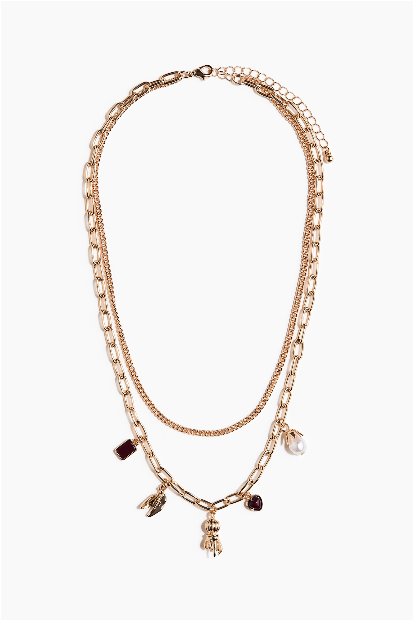 Металлическое ожерелье из двух цепочек, одна из которых украшена подвесками разного дизайна. Регулируемая длина с застежкой-триггером.
