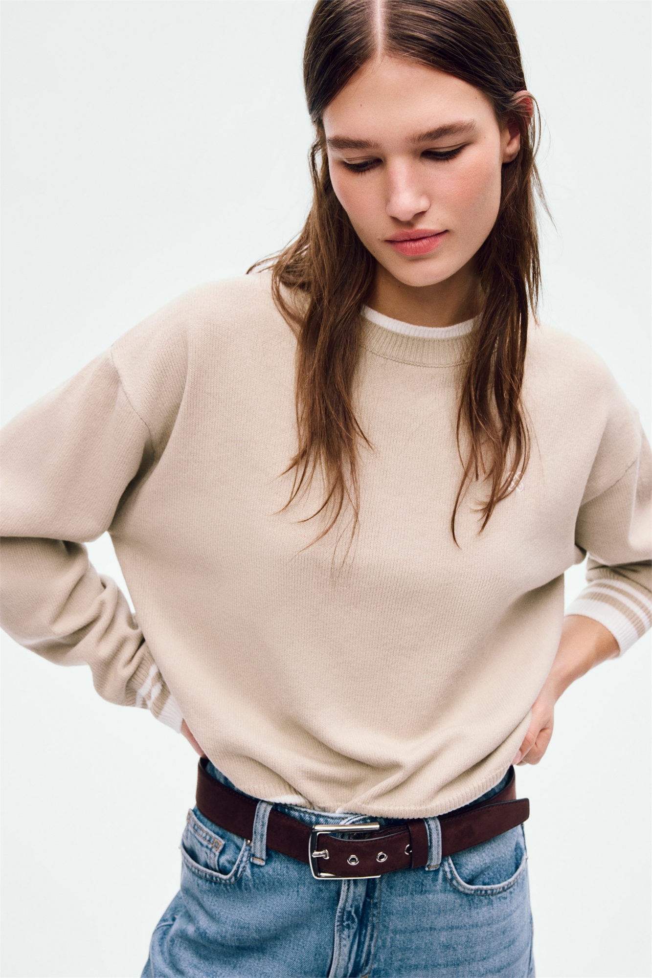 Джемпер из тонкой вязки с круглым вырезом, отделанным резинкой, и дополнительной отделкой контрастного цвета, создающей многослойный эффект. Небольшой вышитый мотив на груди, заниженные плечи и длинные рукава. Резинка с полосками контрастного цвета на манжетах и по низу.