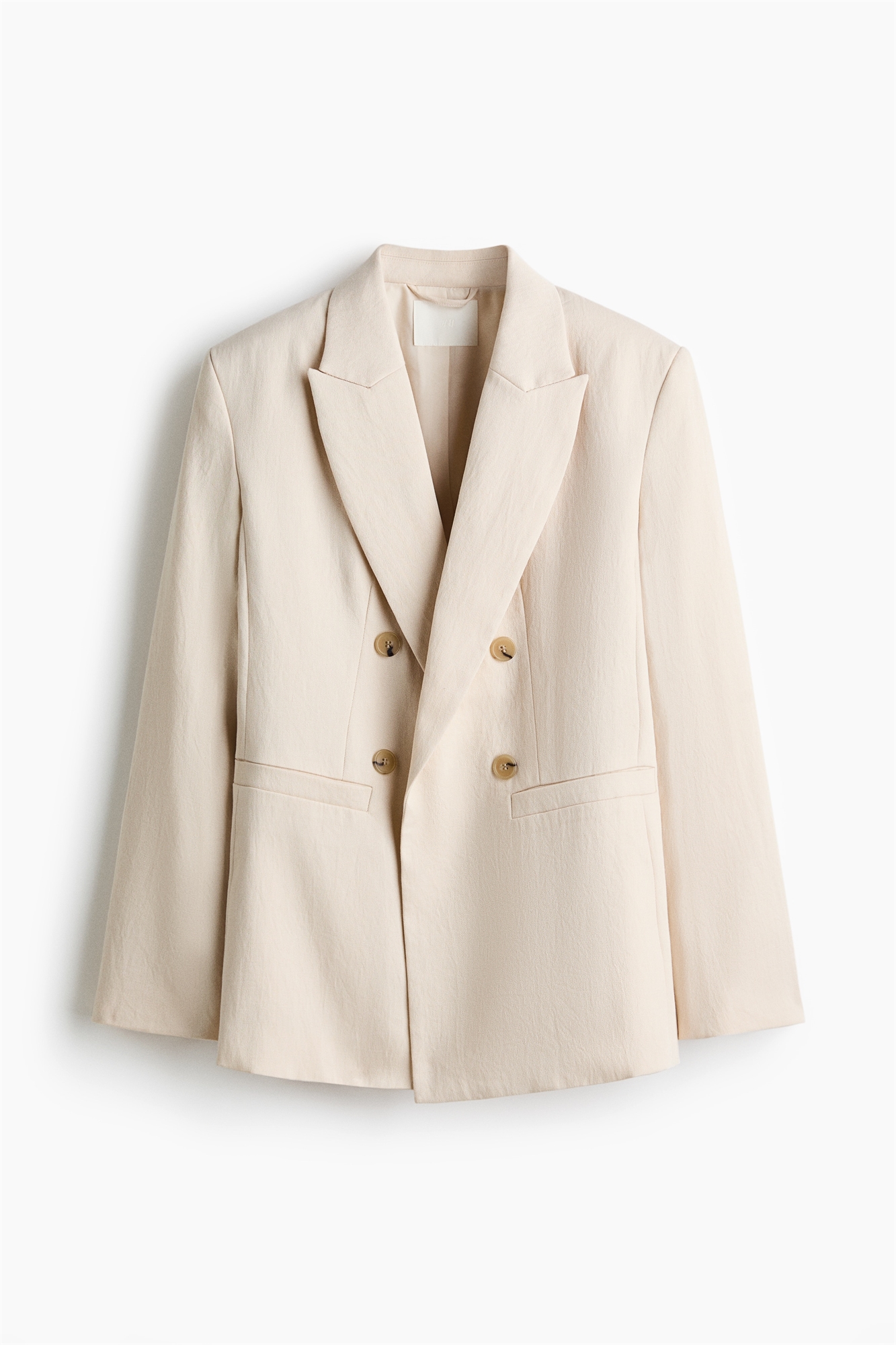 Двубортный блейзер из тканого материала с пикообразными лацканами, декоративными пуговицами спереди и втачными передними карманами. Плечевые накладки и длинные рукава с декоративными пуговицами на манжетах. На подкладке.