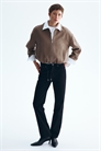 Короткая удлиненная куртка из шерстяной смеси с воротником, застежкой-молнией спереди и боковыми карманами с отворотом. Спущенные плечи, длинные рукава с рагланным швом сзади и узким шнурком на подоле. На подкладке.