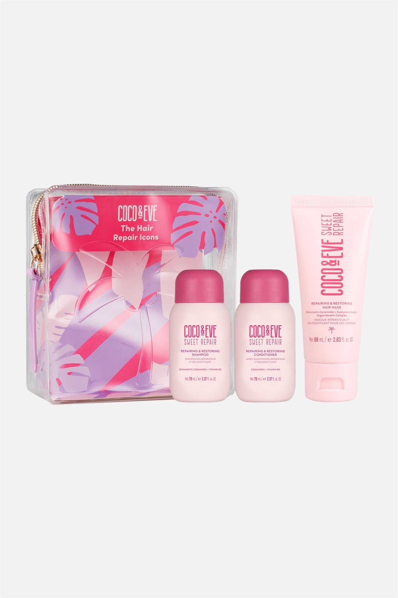 Отправьте поврежденные волосы на реабилитацию с помощью этого восстанавливающего, укрепляющего пряди трио, включающего шампунь, кондиционер и маску Sweet Repair в дорожных размерах в лимитированном пакетике.