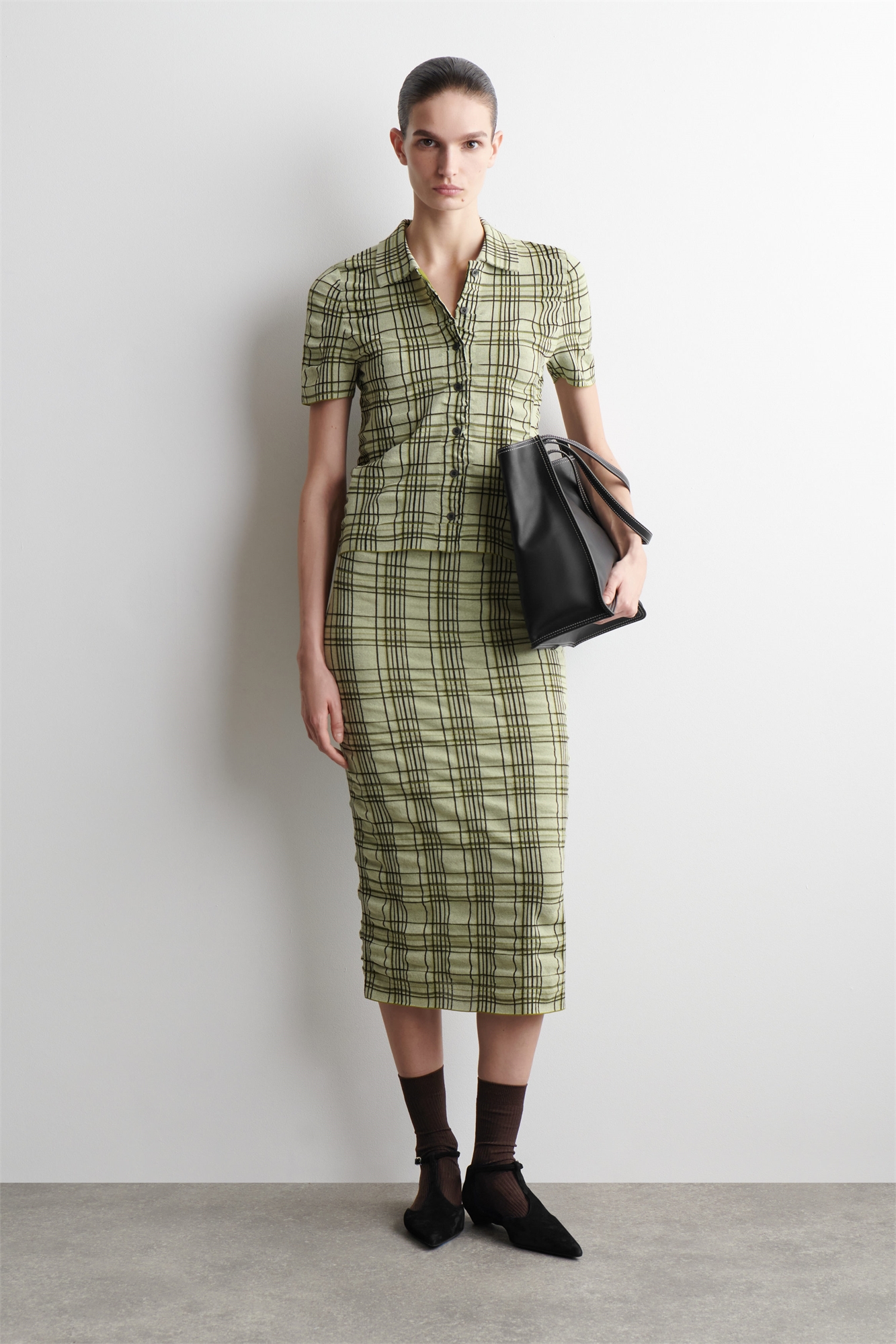 Смелые клетчатые узоры предлагают новый взгляд на наследие в предстоящем сезоне. Эта современная юбка средней длины, выполненная в тональной зеленой палитре, имеет узкий силуэт карандаша и изготовлена из мягкой хлопковой смеси с жаккардовым узором. Сочетайте ее с подходящей рубашкой. Узкий крой. Машинная стирка. Длина спинки размера S составляет 83 см. Модель носит размер S.