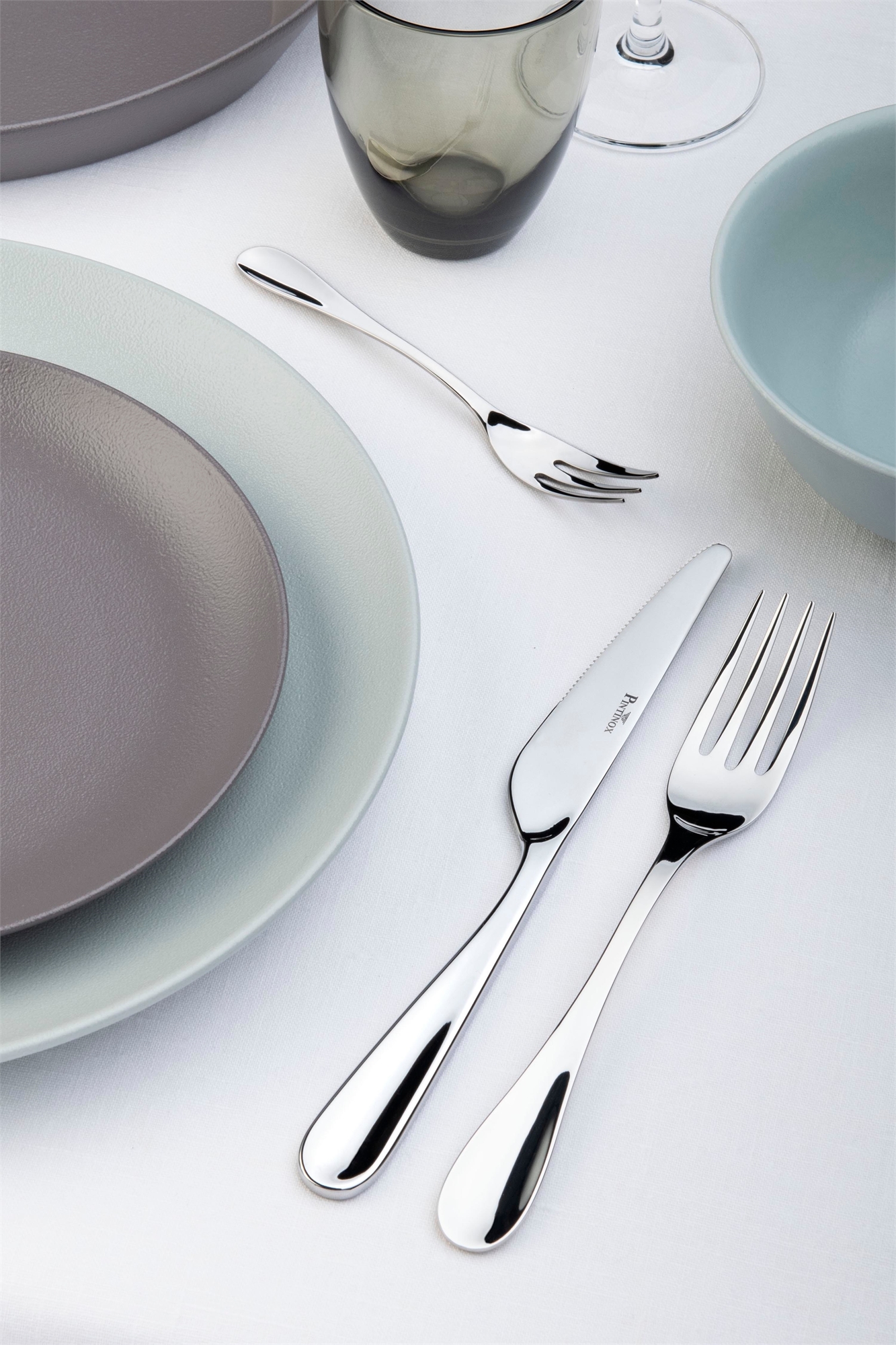 Набор столовых приборов Marilyn характеризуется современным, удобным дизайном с плавными, округлыми контурами. Это универсальная модель с неподвластным времени качеством, которая сочетается с любой сервировкой стола. Набор состоит из 24 предметов: 6 вилок 21,5 см - 6 ложек 21,5 см - 6 ножей 23,5 см - 6 ложек для чая/кофе 13,8 см. Материал: нержавеющая сталь 18/10, толщина 2,5 мм.