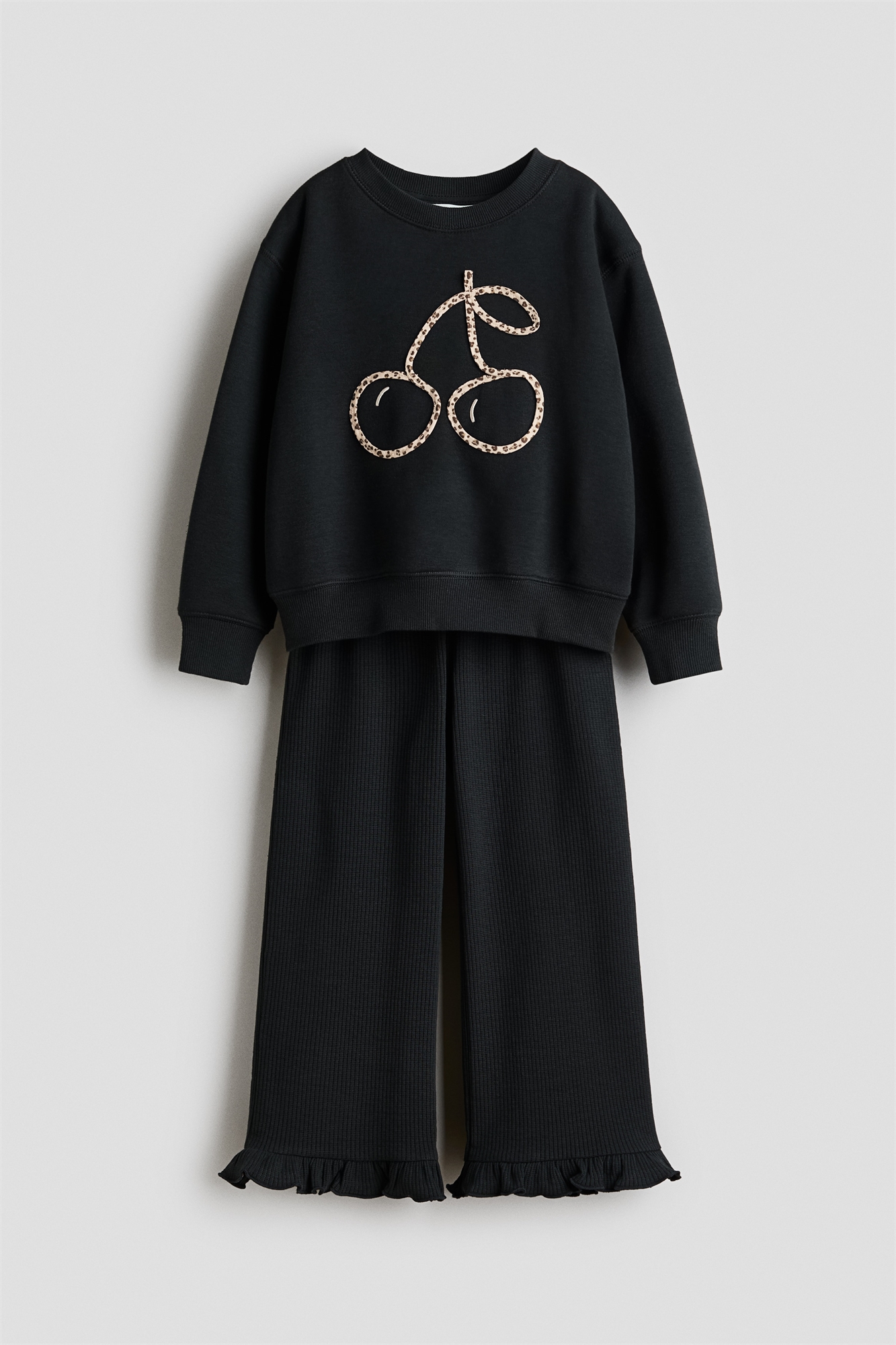 Комплект из топа из толстовки с мягкой ворсистой внутренней стороной и брюк из вафельного хлопкового джерси, оба с деталями из мотивов. Топ с круглым вырезом, отделанным ребрами, спущенными плечами и ребрами на манжетах и подоле. Брюки с оборкой, закрытой эластичной резинкой на талии и оборкой на подоле.
