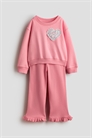 Комплект из топа из толстовки с мягкой ворсистой внутренней стороной и брюк из вафельного хлопкового джерси, оба с деталями из мотивов. Топ с круглым вырезом, отделанным ребрами, спущенными плечами и ребрами на манжетах и подоле. Брюки с оборкой, закрытой эластичной резинкой на талии и оборкой на подоле.