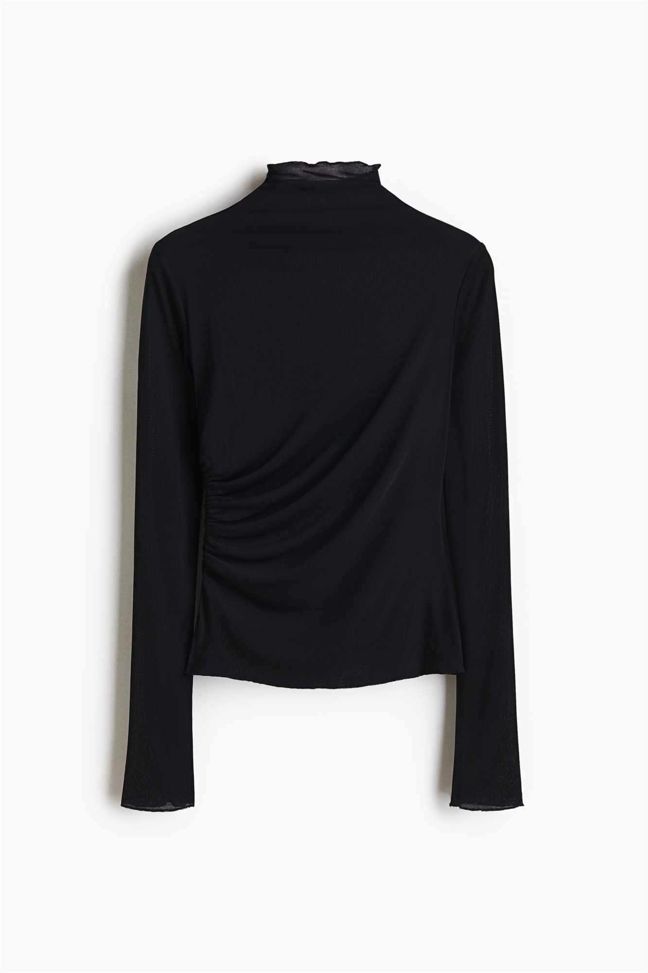Облегающий топ из гладкого трикотажа с отделкой оверлоком. Горловина в виде черепахи, длинные рукава и сборки на талии с одной стороны для создания эффекта драпировки.