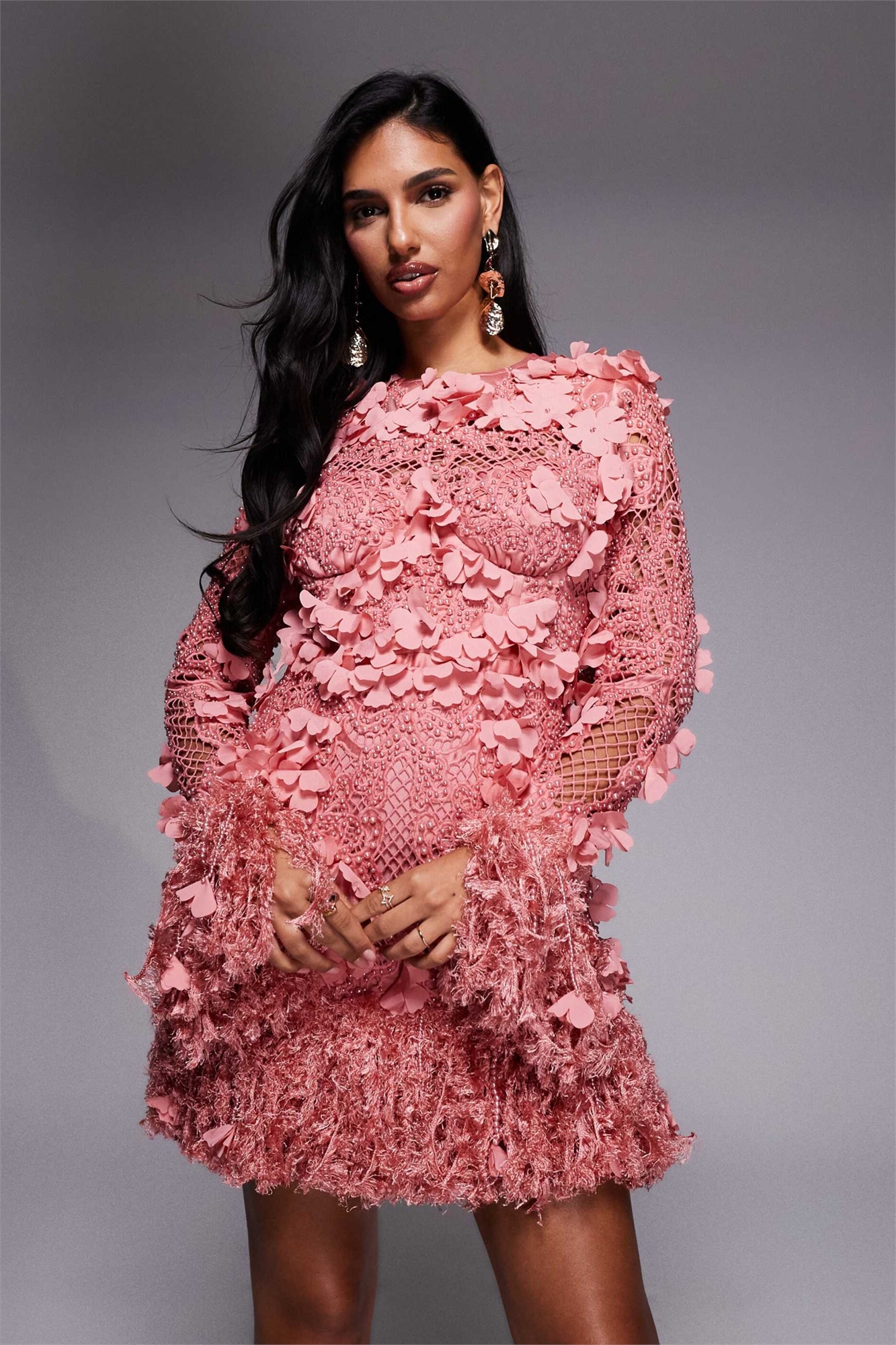 Мини-платье с 3D-цветочным узором в технике «бродер» и отделкой из искусственных перьев