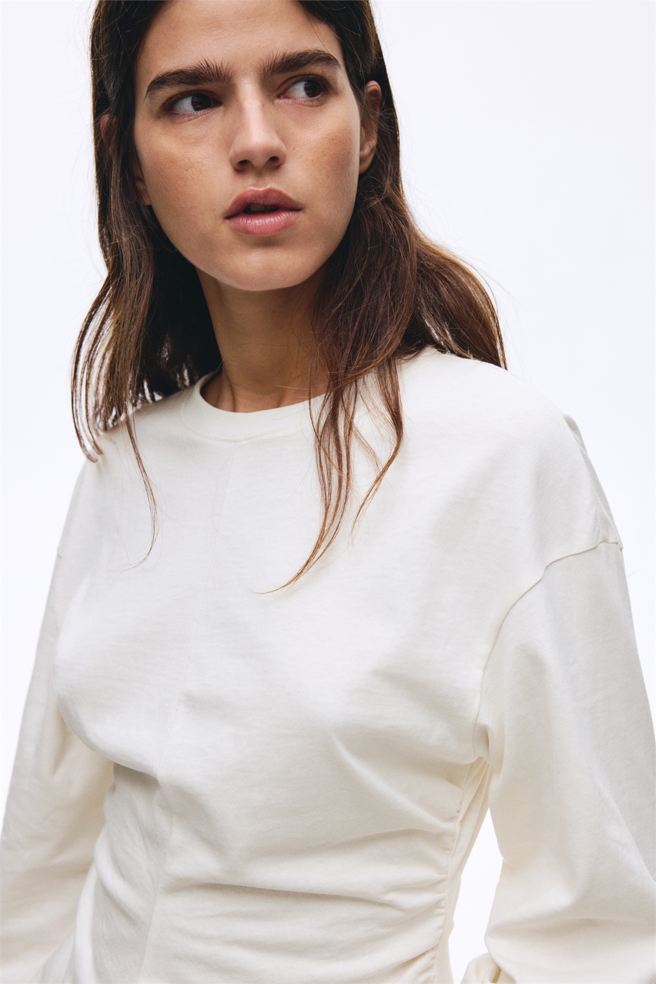 Топ из хлопкового джерси с круглым вырезом, спущенными плечами и длинными рукавами. Складки по бокам и расклешенный подол.