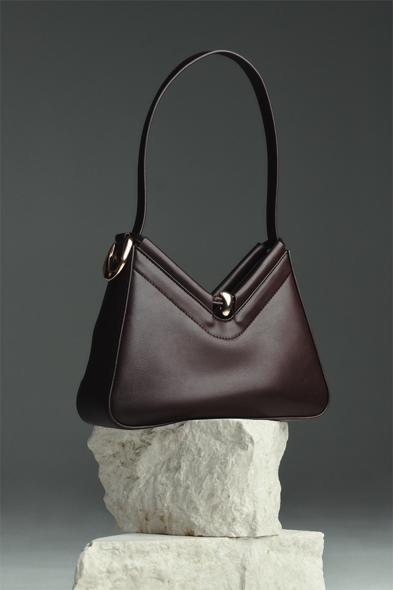 Сумка через плечо из ткани с покрытием, с магнитной застежкой и металлическими деталями в верхней части. Короткий плечевой ремень, который можно продеть через металлическое кольцо с одной стороны для различных вариантов стиля. На подкладке.