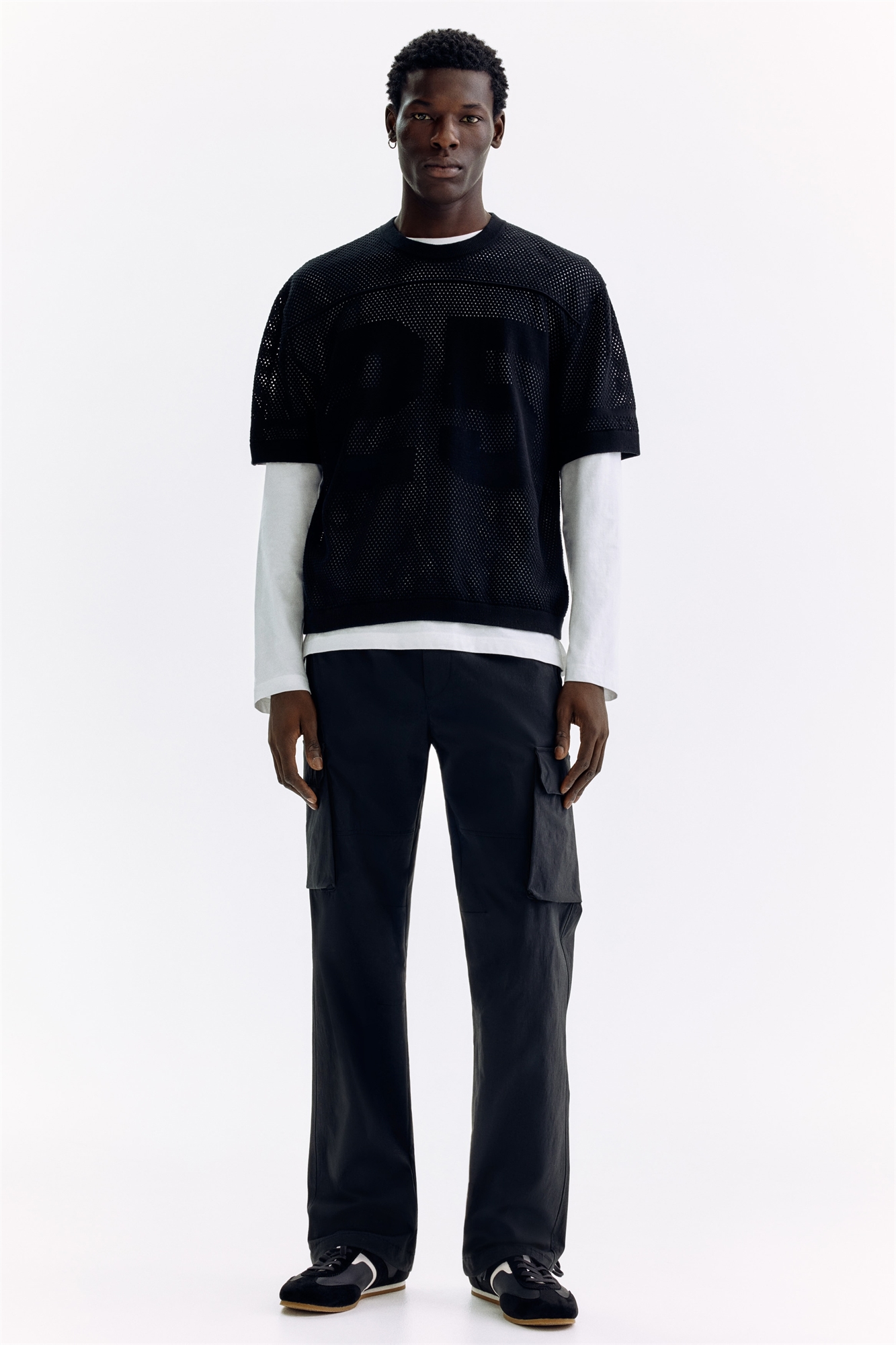 Карго-брюки из нейлона с имитацией ширинки, скрытой резинкой и шнурком на талии. Боковые карманы на молнии, накладные карманы на штанинах с клапанами и потайными кнопками, задние карманы на молнии. Штанины с вытачками на коленях и шнурком с фиксаторами на подоле. Классический крой для удобства ношения и классического силуэта.