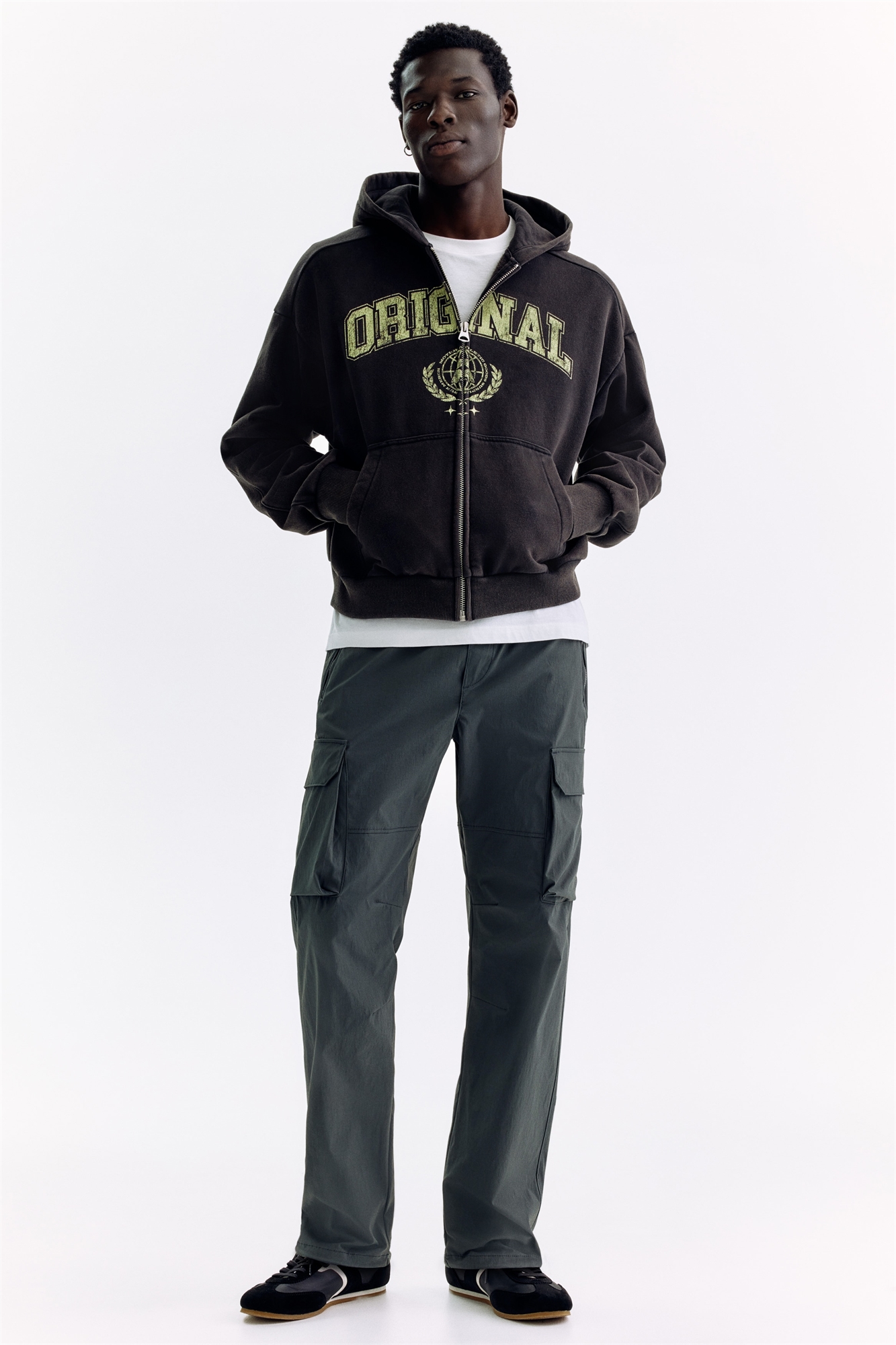 Карго-брюки из нейлона с имитацией ширинки, скрытой резинкой и шнурком на талии. Боковые карманы на молнии, накладные карманы на штанинах с клапанами и потайными кнопками, задние карманы на молнии. Штанины с вытачками на коленях и шнурком с фиксаторами на подоле. Классический крой для удобства ношения и классического силуэта.