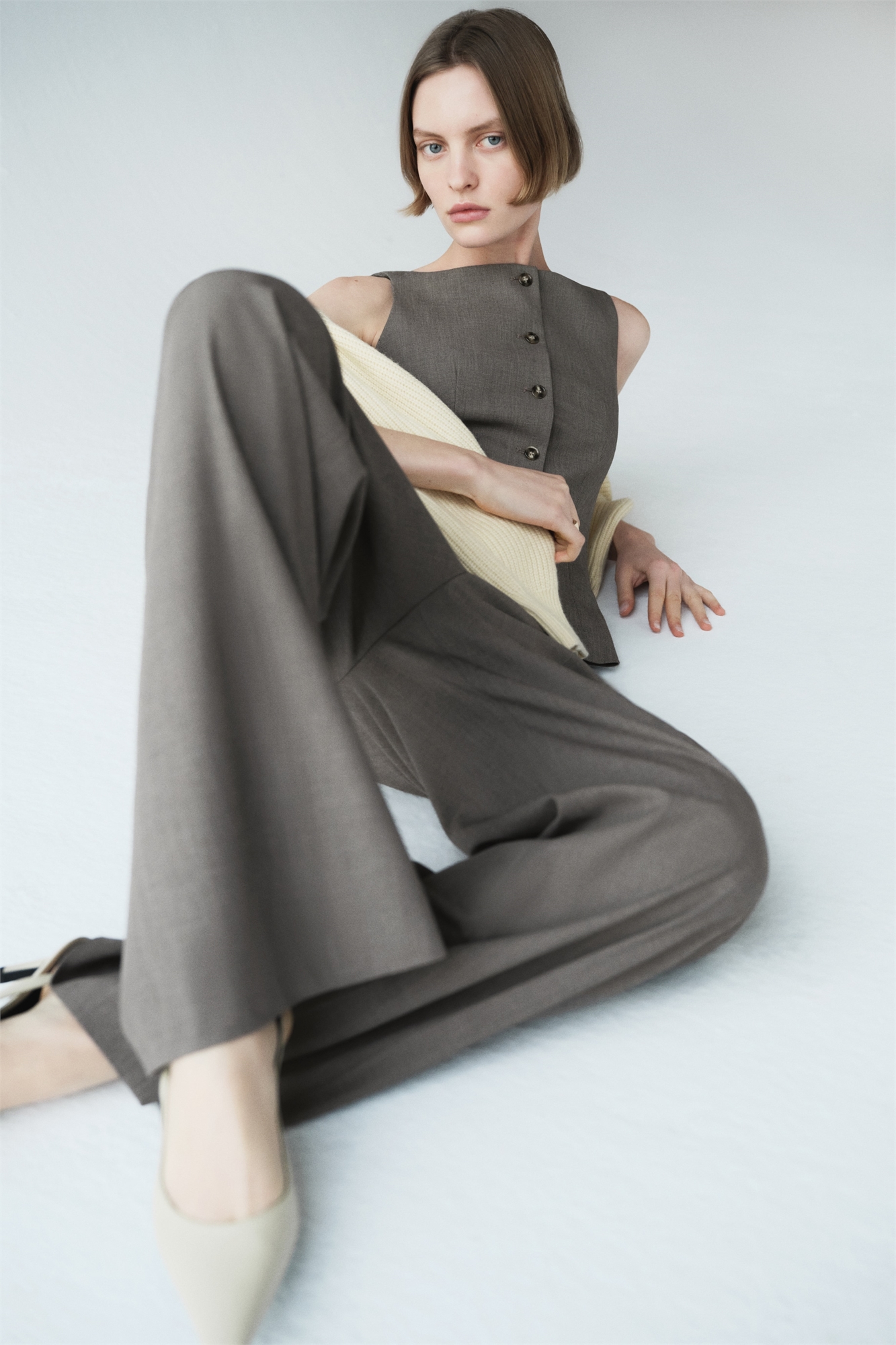 Приталенный жилет из тканого материала с квадратным вырезом, широкими плечевыми лямками и пуговицами спереди. Формообразующие швы спереди и сзади для приталенного вида. На подкладке.