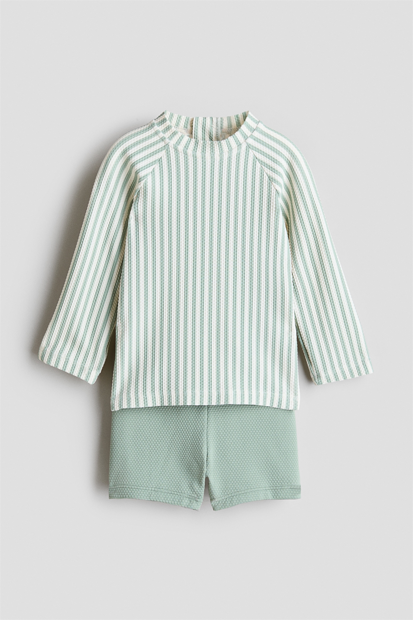 Текстурированный комплект из купального топа и шорт из ткани с защитой от ультрафиолета UPF 50. Топ с небольшим воротником-стойкой, длинными рукавами реглан, минимизирующими риск трения, и застежкой-молнией с защитой от натирания сзади. Шорты с эластичным поясом и подкладкой спереди. Коллекция H&M Adorables — это тщательно подобранный ассортимент удобных и качественных моделей с неподвластным времени дизайном.