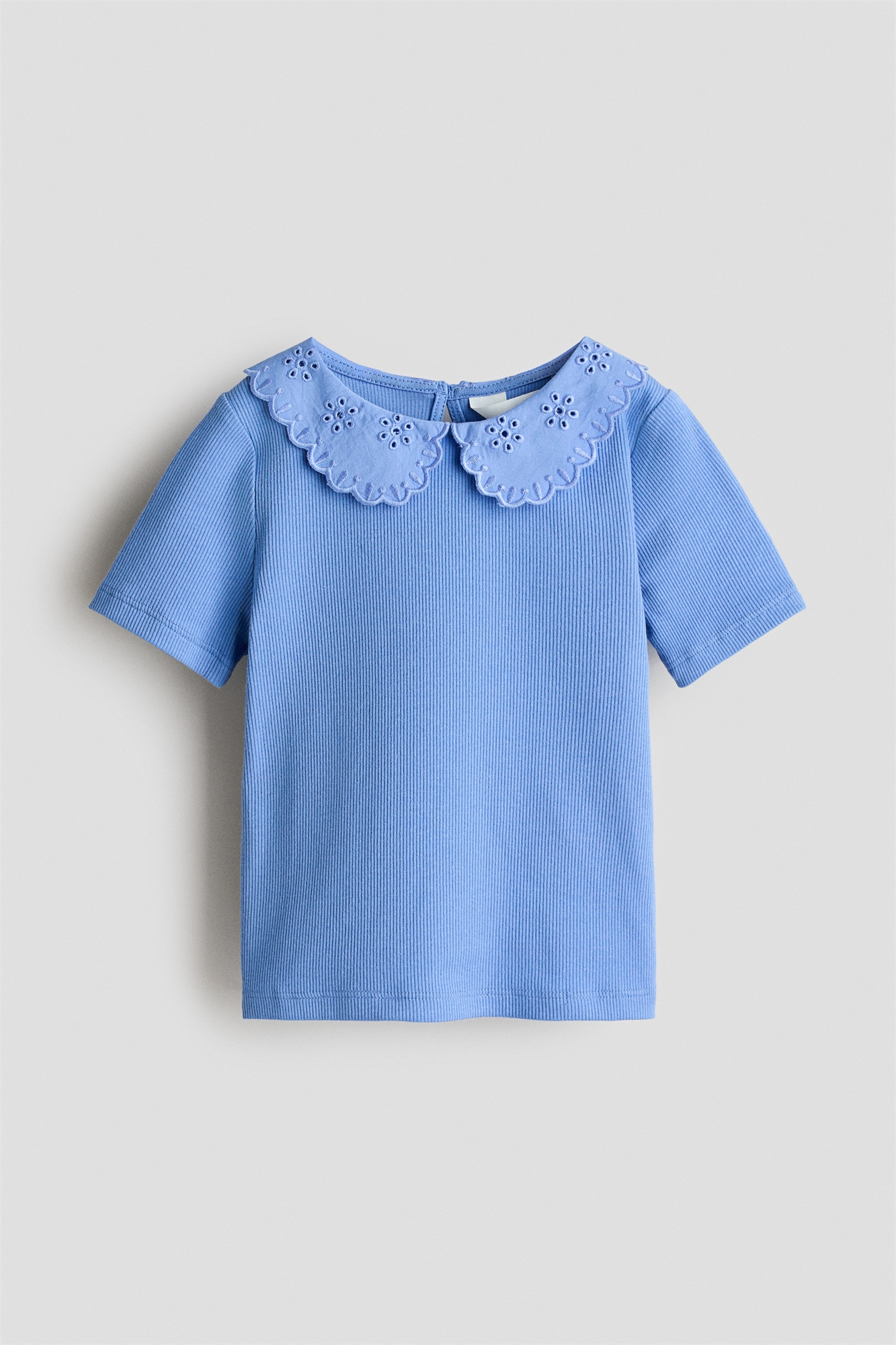 Топ из мягкого хлопкового джерси с ребристой текстурой, с тканым воротником Питера Пэна с английской вышивкой. Вырез в форме ключа с застежкой на пуговице и петле сзади на шее.