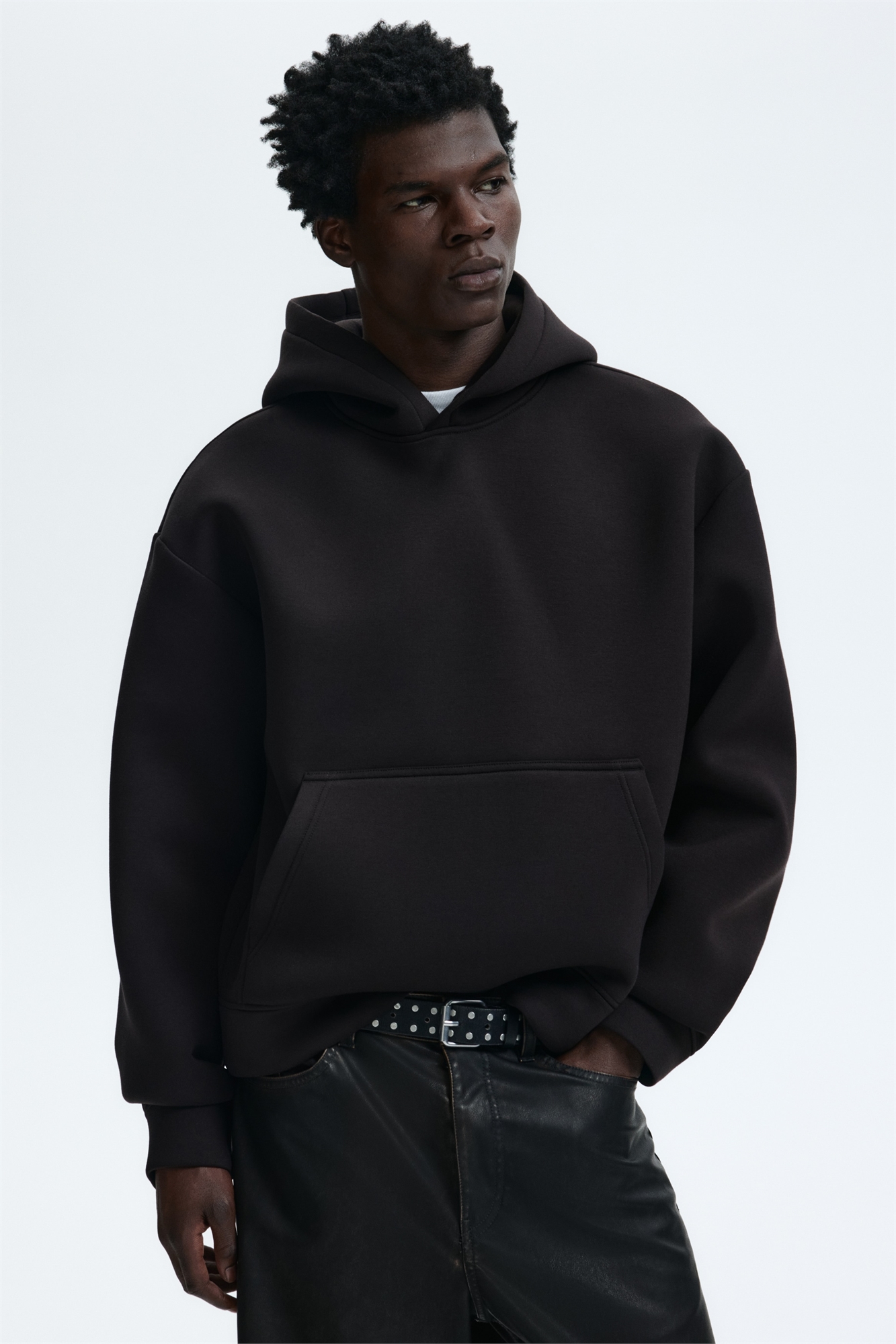 Толстовка из ткани скуба с двухслойным капюшоном, спущенными плечами, длинными рукавами, карманом-кенгуру и широкой отделкой на манжетах и подоле. Свободный крой для пышного, но не слишком большого силуэта.