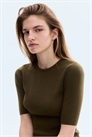Приталенная футболка из тонкого ребристого трикотажа с узкой окантовкой вокруг выреза и рукавами до локтей.