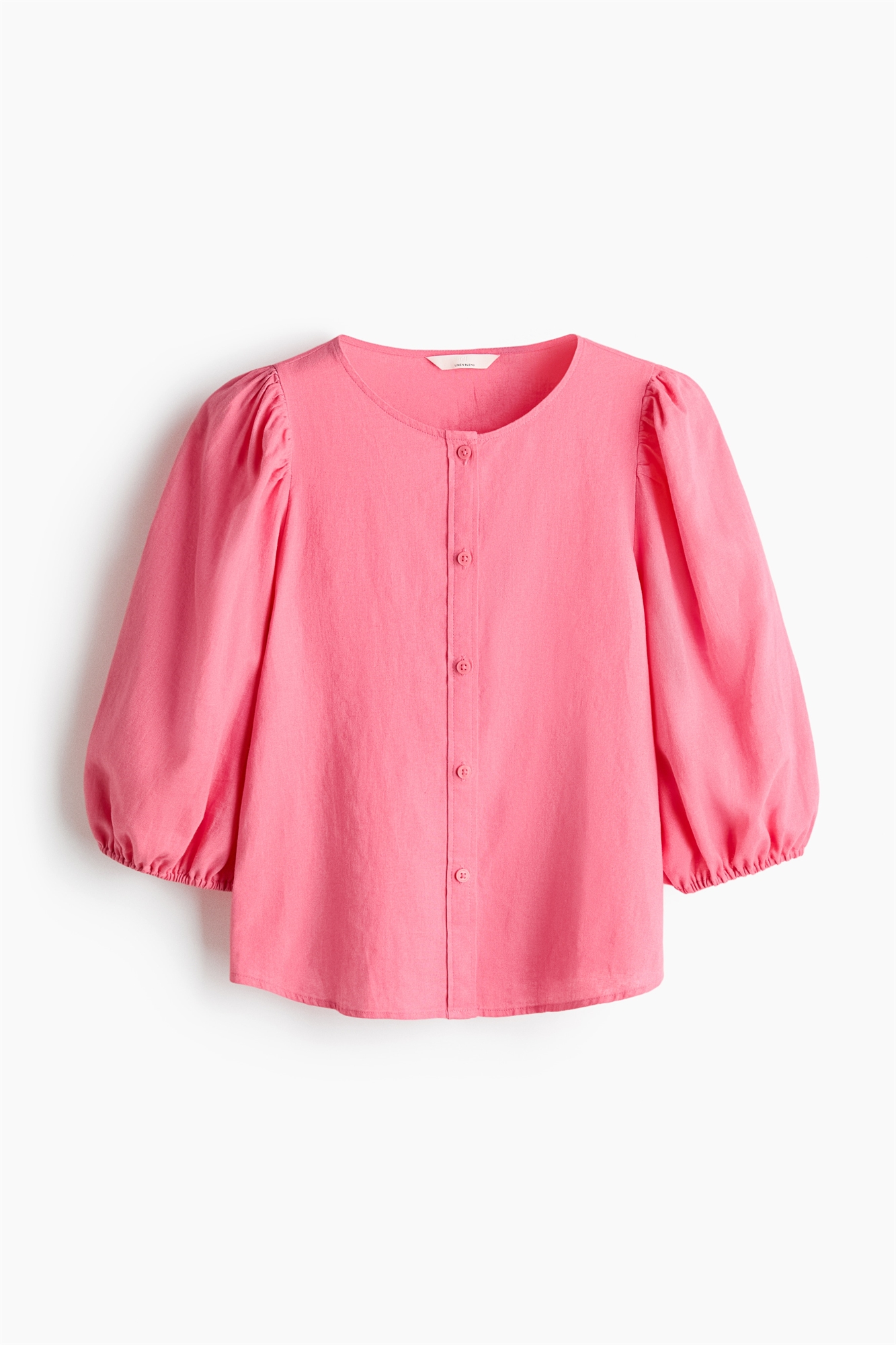 Блузка из легкой ткани, изготовленной из смеси льна и вискозы. Круглый вырез, пуговицы попереду и рукава длиной 3/4 с эластичными манжетами.