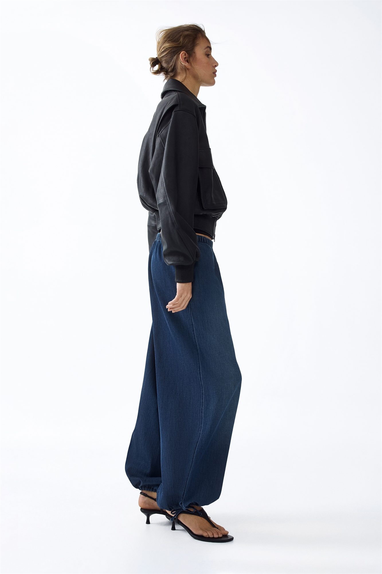 Брюки свободного кроя до щиколотки из мягкого денима с эластичным поясом и незаметными боковыми карманами. Брюки с расклешенными штанинами, разрезом и узким шнурком на подоле.