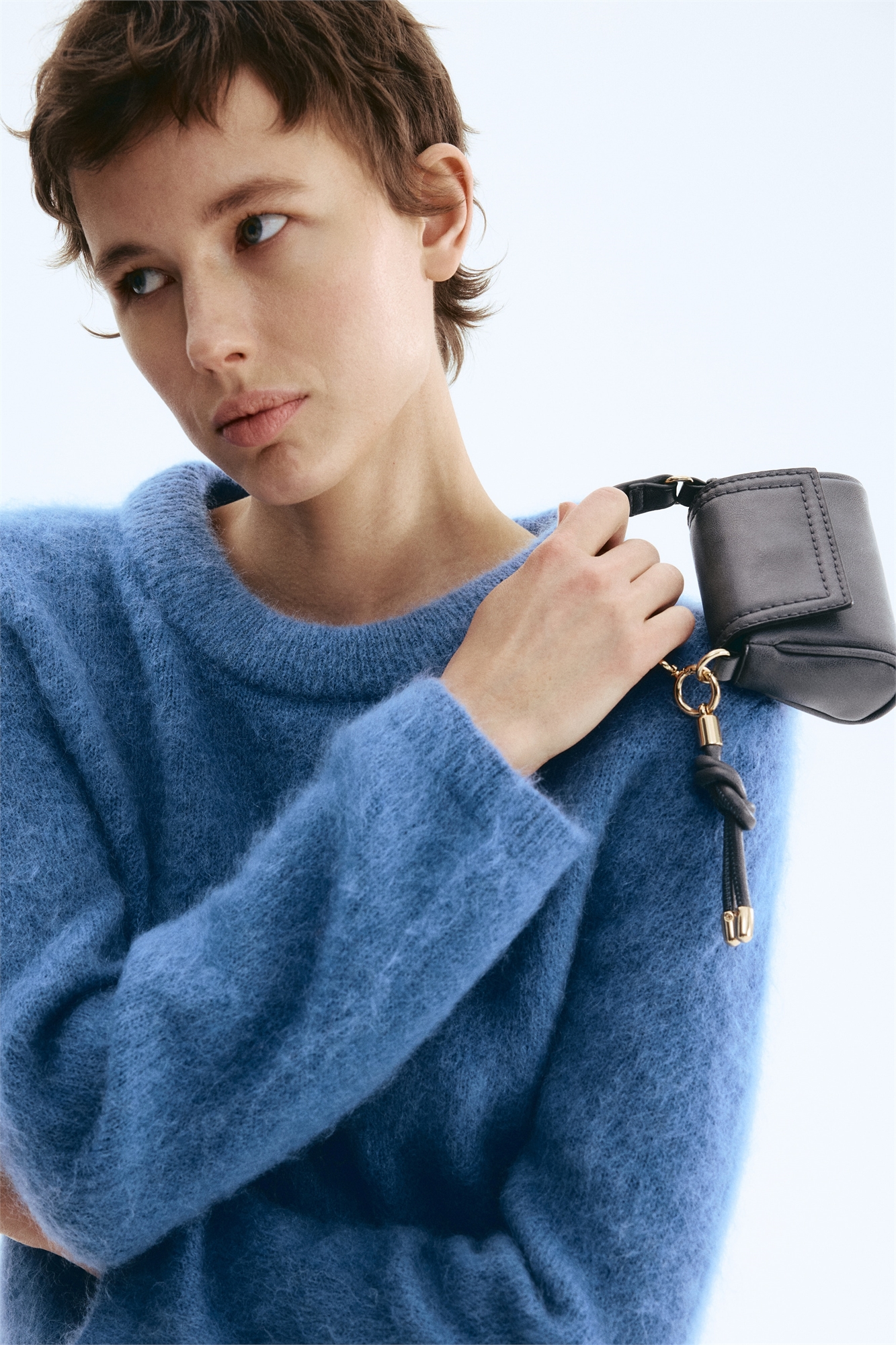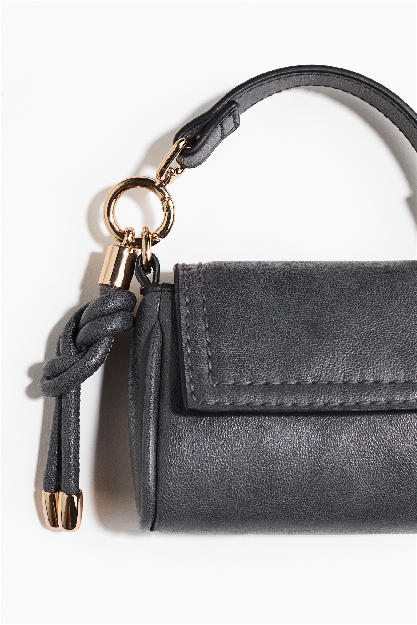 Мини-сумочка с клапаном и потайной магнитной застежкой в верхней части, а также ручкой с пружинным кольцом и брелоком в виде узла на одном конце. Используйте ее как небольшую сумочку или практичный брелок для хранения мелких ценных вещей. На подкладке.