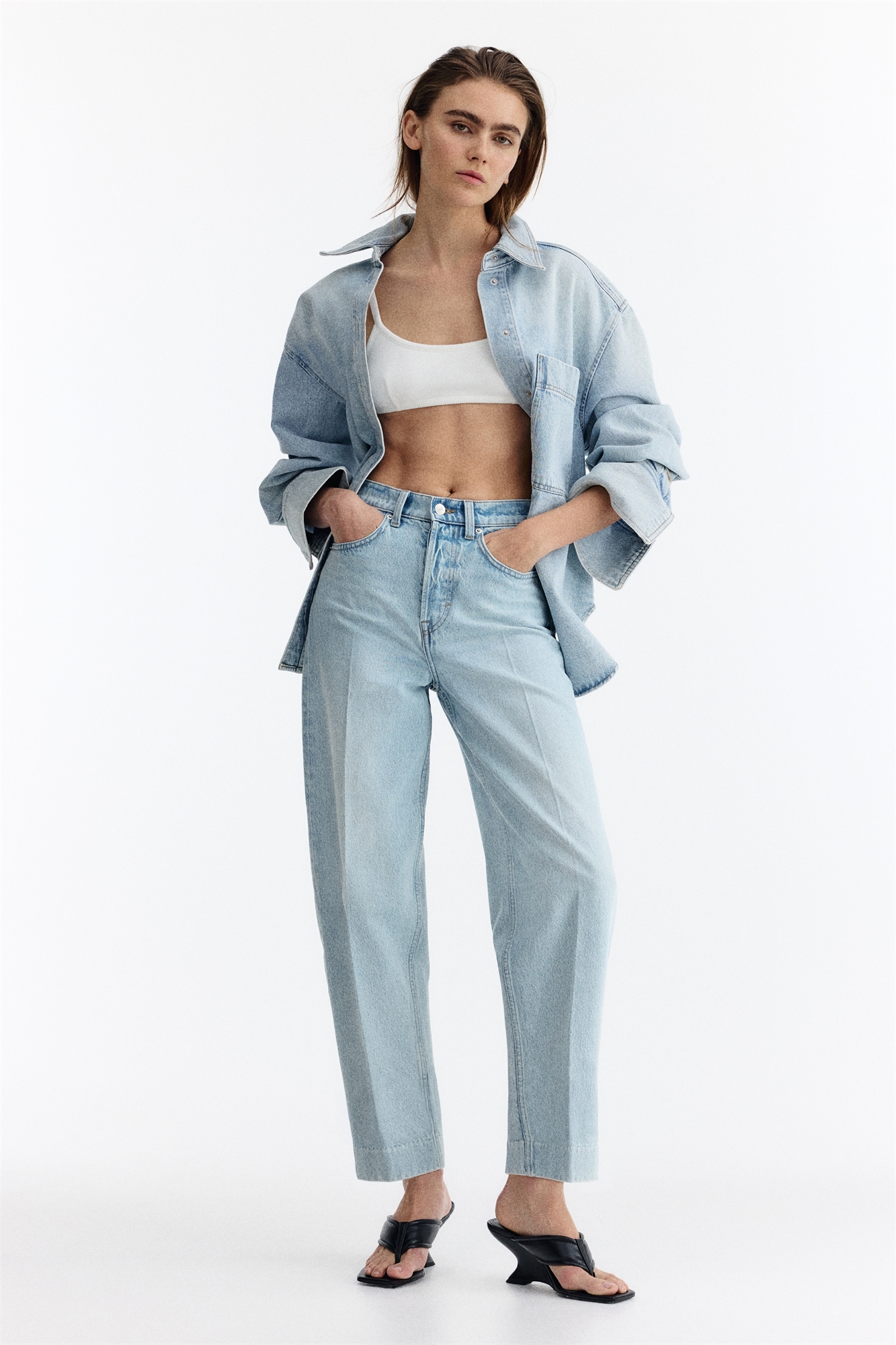 Джинсы с 5 карманами из жесткого хлопкового денима, который сначала кажется упругим, но затем смягчается и ослабевает по мере носки. Изогнутая, объемная штанина с регулярной посадкой от бедра до бедра, которая сужается к подолу. Высокая талия с ширинкой на пуговице и складками спереди и сзади. Длина по щиколотку, зауженная к лодыжкам. Непринужденная и прохладная джинсовая одежда.