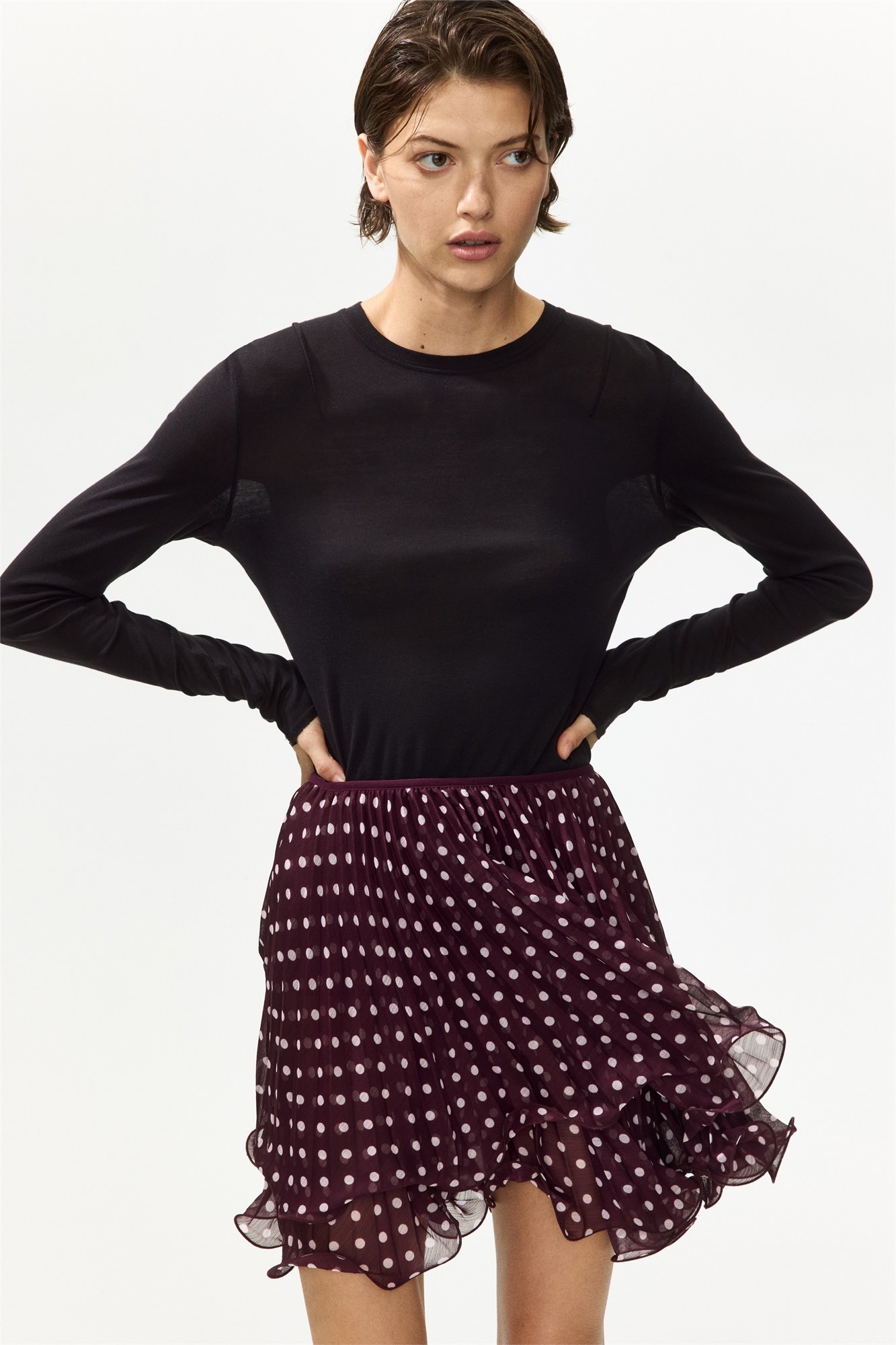 Мини-юбка из двух слоев плиссированного шифона с оверлочными краями, создающими воланы на подоле. Высокая эластичная талия. Без подкладки.