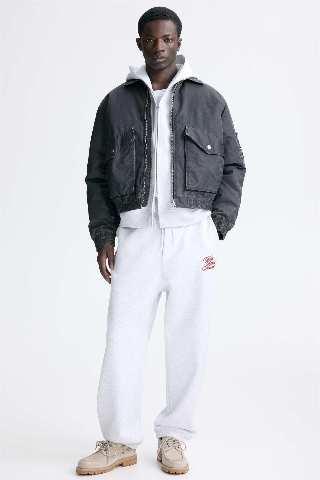 Тренировочные брюки из плотной толстовочной ткани из смеси хлопка с мягким начесом внутри. Эластичный пояс с завязками на талии и фальшивой ширинкой. Боковые карманы и задний накладной карман. Свободный крой для пышного, но не чрезмерно большого силуэта.