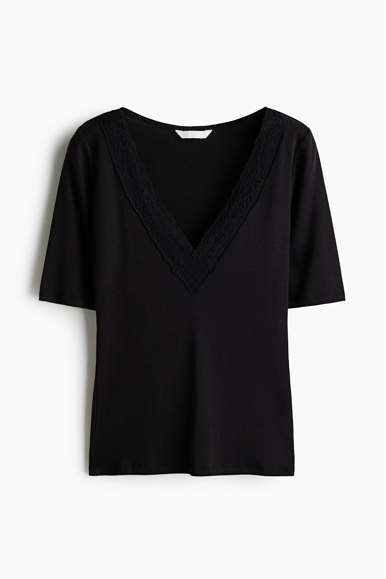 Приталенный топ из мягкого ребристого джерси с глубоким V-образным вырезом, отделанным кружевом, и короткими рукавами.