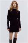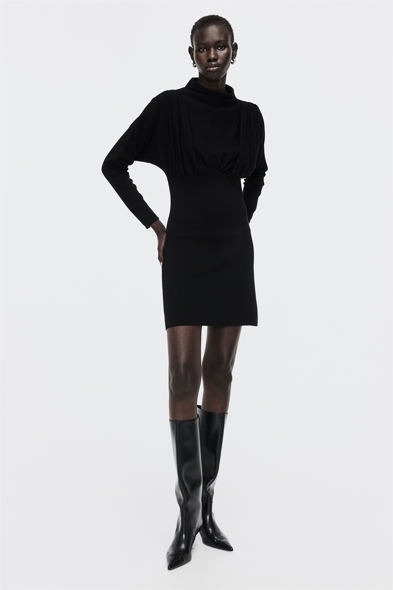 Короткое платье из джерси с горловиной-черепахой, складками на плечах, длинными рукавами и сборкой под бюстом.