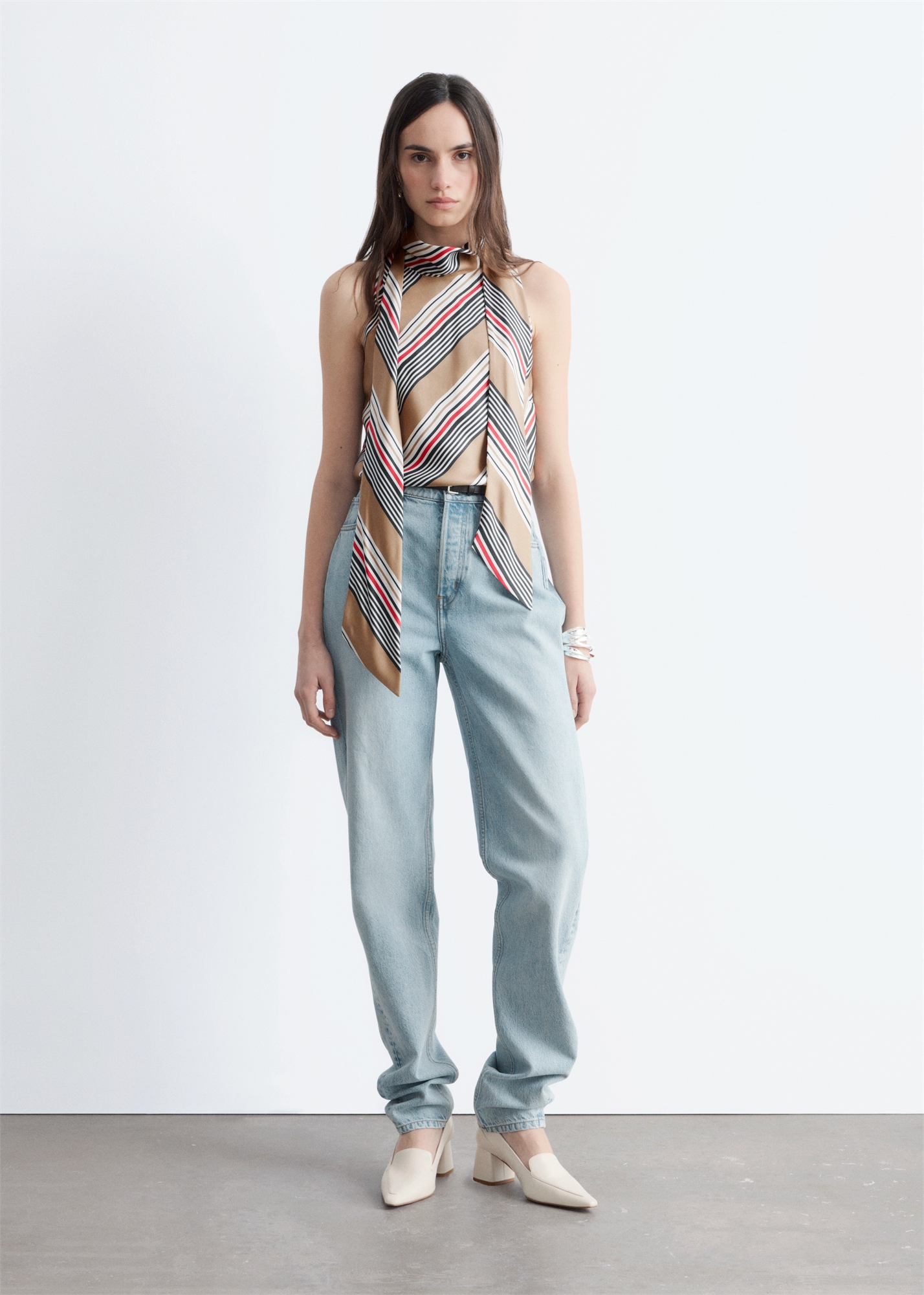Этот топ без рукавов, изготовленный из шелка тутового дерева, украшен ярким графическим принтом и имеет встроенный шарф, который завязывается на шее. Завершает образ вырез в форме замочной скважины с застежкой-крючком на шее.